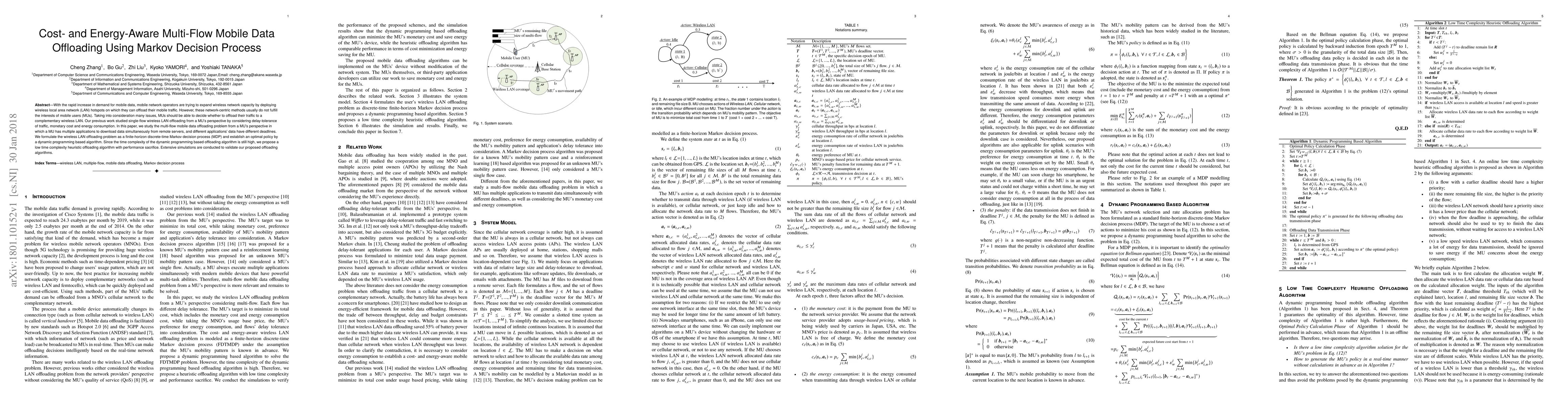 This paper proposes a cost- and energy-aware multi-flow mobile data offloading strategy using a Markov Decision Process (MDP) to optimize wireless LAN offloading from the user's perspective. It introduces an optimal dynamic programming algorithm and a heuristic approach to manage multiple applications with varying deadlines, validated through extensive simulations.
