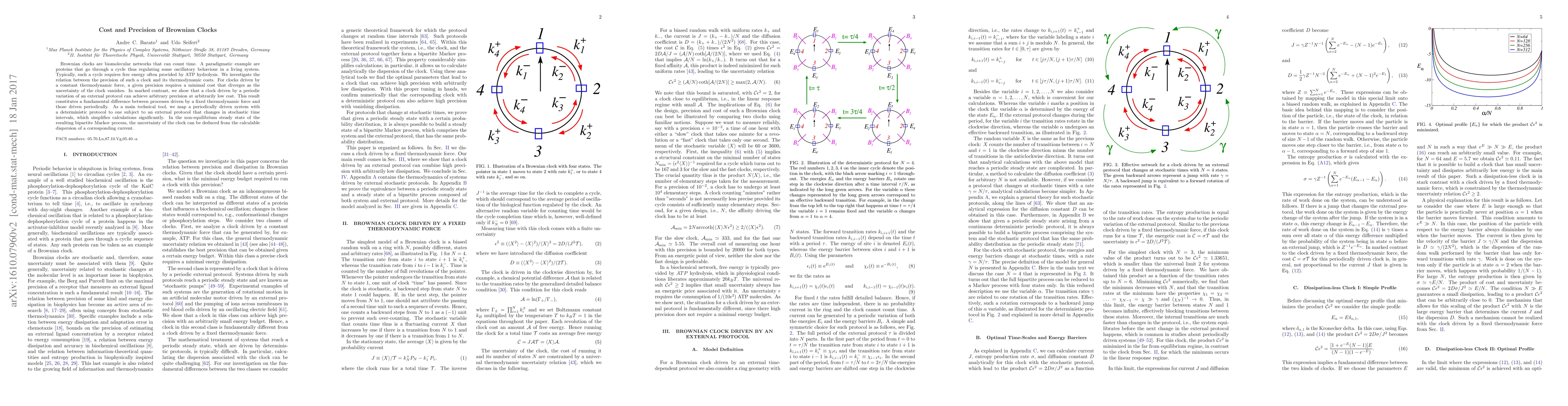 Brownian clocks are biomolecular networks that can count time. A paradigmatic example are proteins that go through a cycle thus regulating some oscillatory behaviour in a living system. Typically, such a cycle requires free energy often provided by ATP hydrolysis. We investigate the relation between the precision of such a clock and its thermodynamic costs. For clocks driven by a constant thermodynamic force, a given precision requires a minimal cost that diverges as the uncertainty of the clock vanishes. In marked contrast, we show that a clock driven by a periodic variation of an external protocol can achieve arbitrary precision at arbitrarily low cost. This result constitutes a fundamental difference between processes driven by a fixed thermodynamic force and those driven periodically. As a main technical tool, we map a periodically driven system with a deterministic protocol to one subject to an external protocol that changes in stochastic time intervals, which simplifies calculations significantly. In the non-equilibrium steady state of the resulting bipartite Markov process, the uncertainty of the clock can be deduced from the calculable dispersion of a corresponding current.
