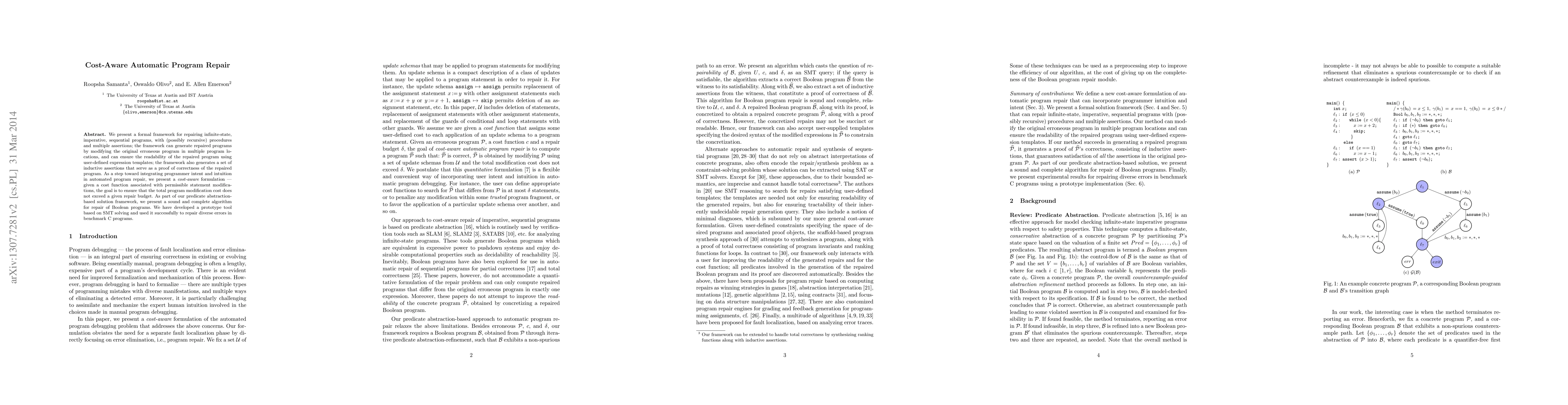 We present a formal framework for repairing infinite-state, imperative, sequential programs, with (possibly recursive) procedures and multiple assertions; the framework can generate repaired programs by modifying the original erroneous program in multiple program locations, and can ensure the readability of the repaired program using user-defined expression templates; the framework also generates a set of inductive assertions that serve as a proof of correctness of the repaired program. As a step toward integrating programmer intent and intuition in automated program repair, we present a " cost-aware" formulation - given a cost function associated with permissible statement modifications, the goal is to ensure that the total program modification cost does not exceed a given repair budget. As part of our predicate abstraction-based solution framework, we present a sound and complete algorithm for repair of Boolean programs. We have developed a prototype tool based on SMT solving and used it successfully to repair diverse errors in benchmark C programs.