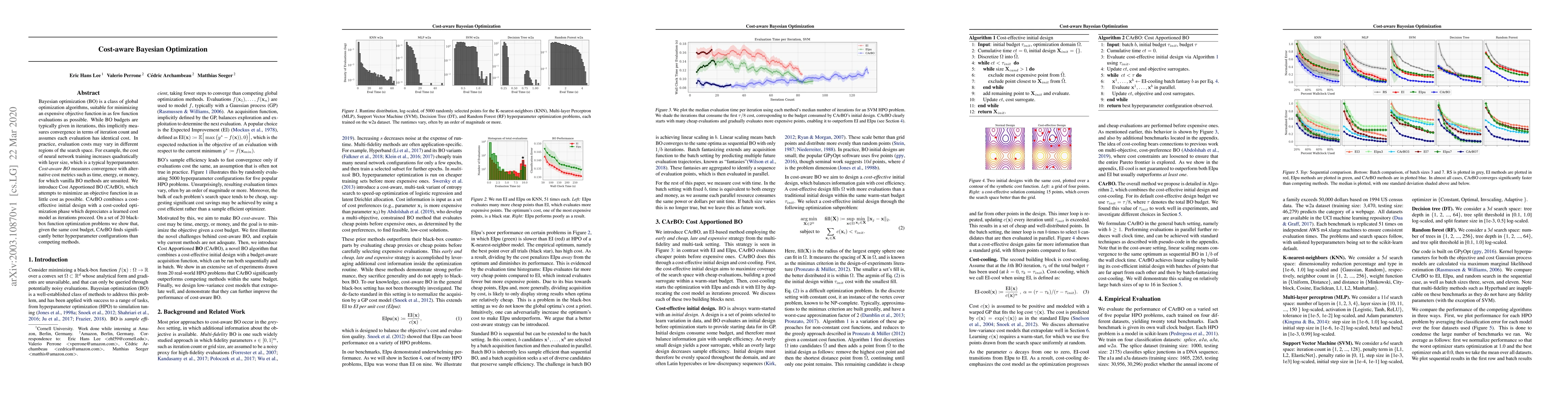 This paper introduces Cost Apportioned Bayesian Optimization (CArBO), a method that optimizes expensive objective functions by minimizing costs such as time, energy, or money, rather than just iterations. CArBO combines an efficient initial design with a cost-cooled optimization phase, demonstrating superior performance in finding optimal hyperparameters within given cost budgets on 20 black-box function optimization problems.