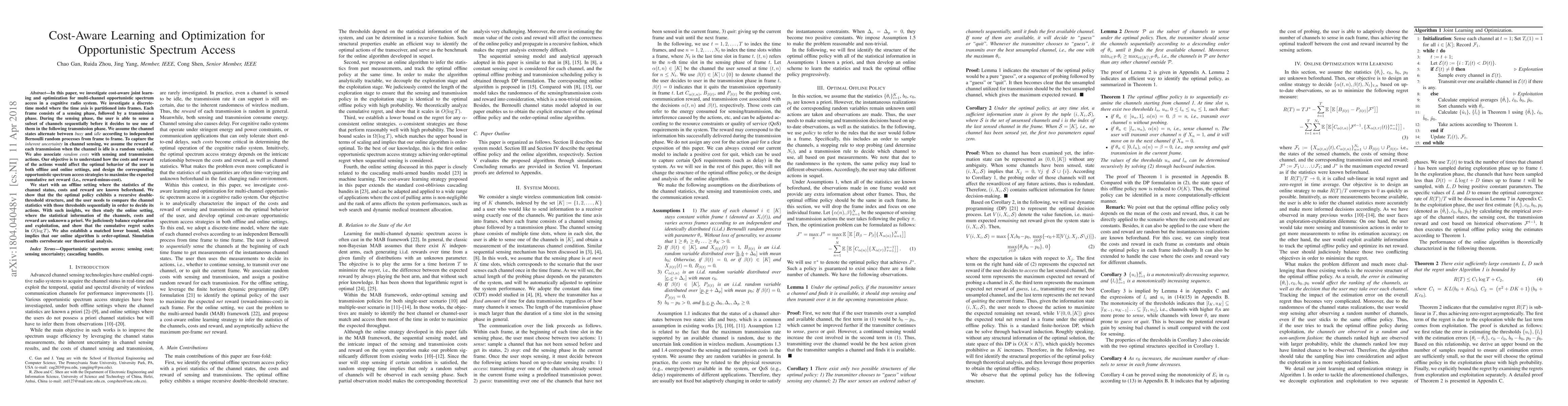 This paper explores cost-aware joint learning and optimization for multi-channel opportunistic spectrum access in cognitive radio systems. It develops an offline optimal policy with a recursive double threshold structure and an online algorithm balancing exploration and exploitation, achieving O(log T) cumulative regret.