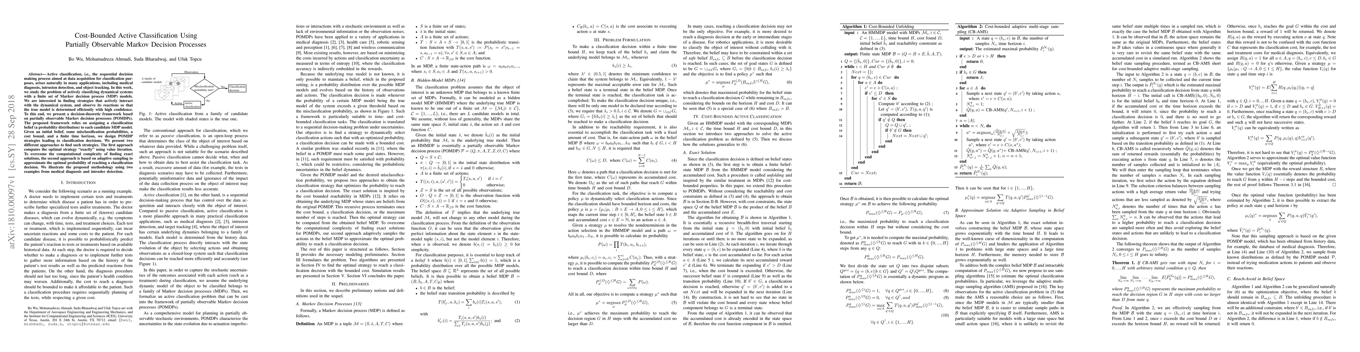 This paper proposes a framework for cost-bounded active classification using partially observable Markov decision processes (POMDPs) to determine the true model of dynamical systems efficiently. It presents two methods for finding optimal strategies: exact value iteration and adaptive sampling approximation.