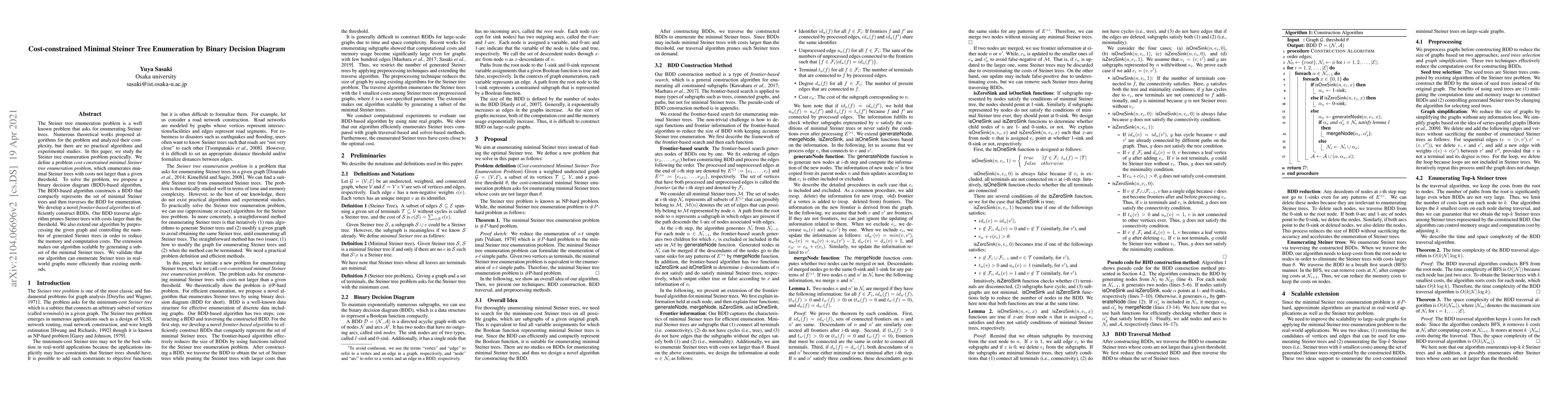 This paper proposes a BDD-based algorithm for the cost-constrained minimal Steiner tree enumeration problem, introducing a novel frontier-based algorithm for efficient BDD construction and an optimized BDD traverse method to prune high-cost trees. The preprocessing and control mechanisms enhance scalability and efficiency.