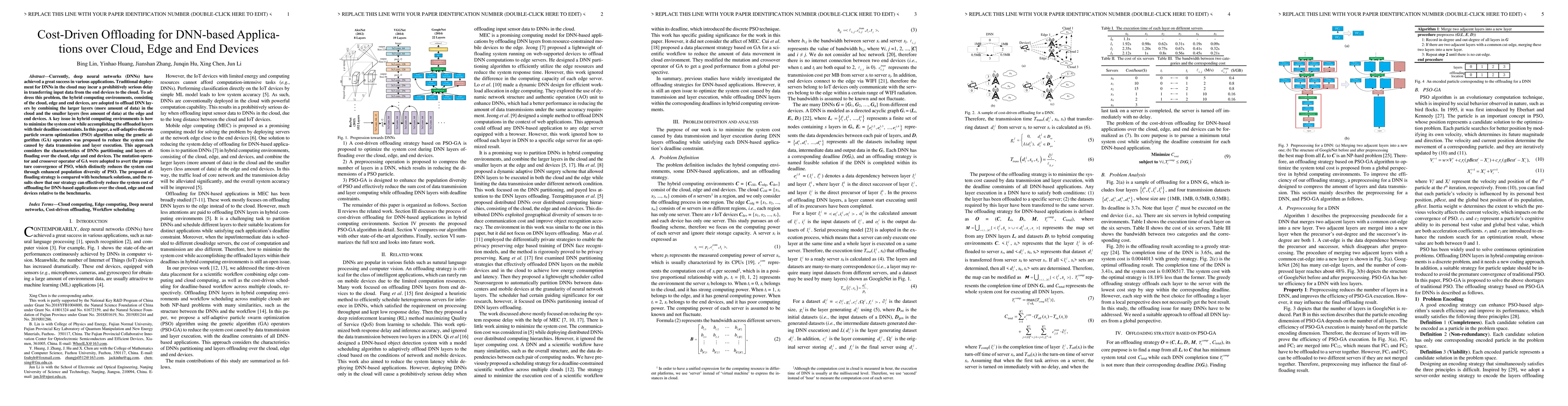 This paper proposes a self-adaptive discrete particle swarm optimization (PSO) algorithm enhanced with genetic algorithm (GA) operators to minimize the cost of offloading deep neural networks (DNNs) across cloud, edge, and end devices, balancing data partitioning and execution. The strategy effectively reduces system cost while meeting offloaded layers' deadline constraints, outperforming benchmark solutions.