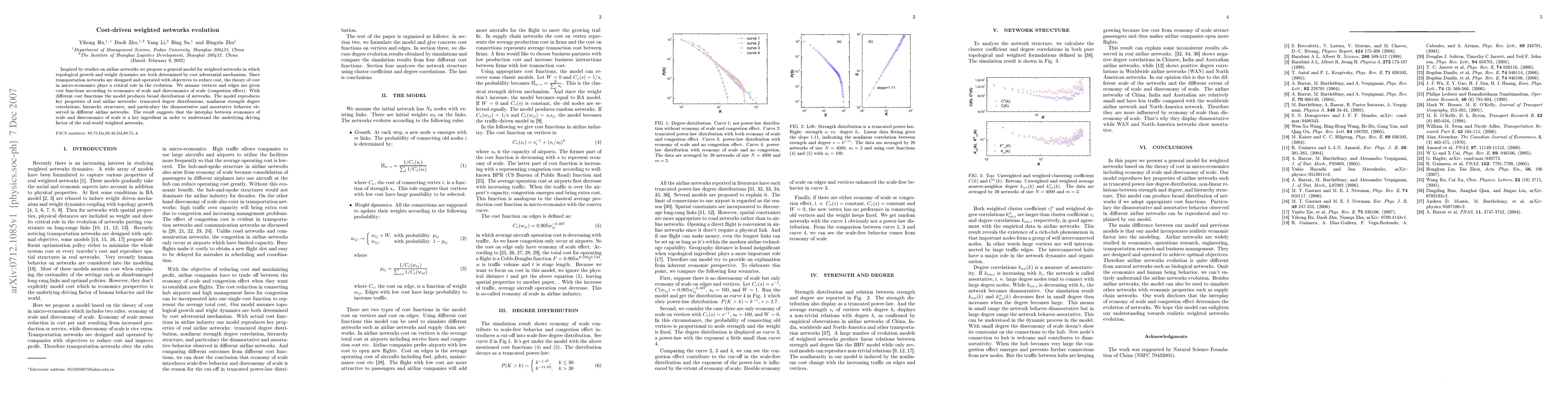 Inspired by studies on airline networks we propose a general model for weighted networks in which topological growth and weight dynamics are both determined by cost adversarial mechanism. Since transportation networks are designed and operated with objectives to reduce cost, the theory of cost in micro-economics plays a critical role in the evolution. We assume vertices and edges are given cost functions according to economics of scale and diseconomics of scale (congestion effect). With different cost functions the model produces broad distribution of networks. The model reproduces key properties of real airline networks: truncated degree distributions, nonlinear strength degree correlations, hierarchy structures, and particulary the disassortative and assortative behavior observed in different airline networks. The result suggests that the interplay between economics of scale and diseconomics of scale is a key ingredient in order to understand the underlying driving factor of the real-world weighted networks.