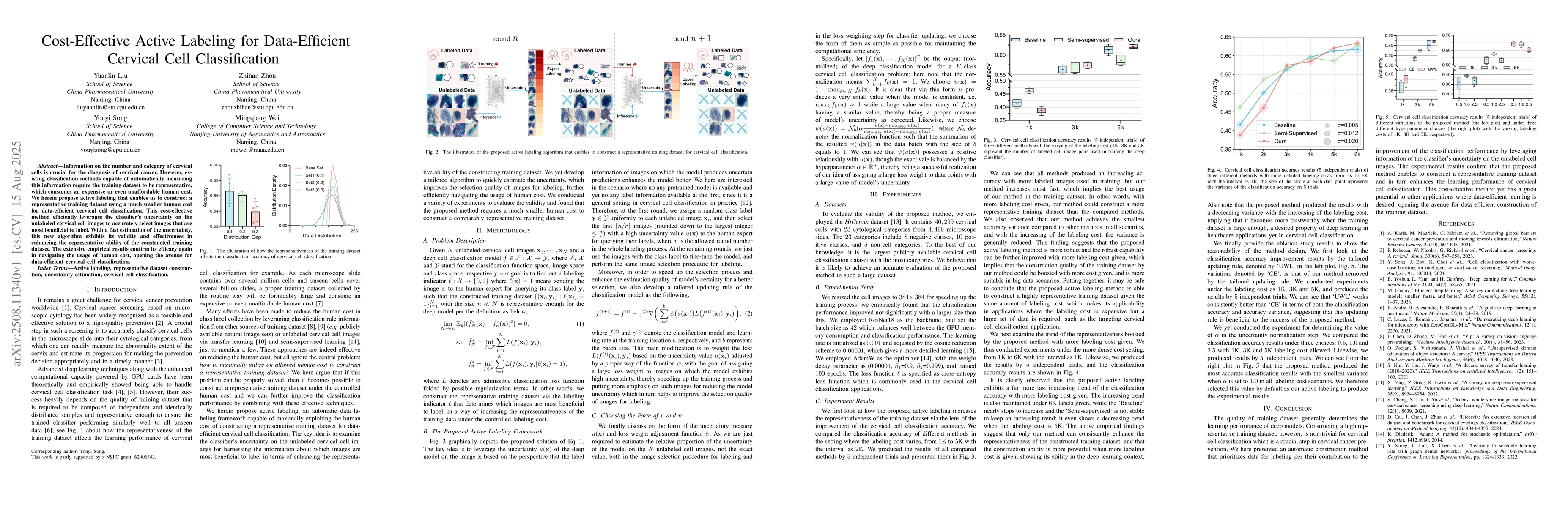 Information on the number and category of cervical cells is crucial for the diagnosis of cervical cancer. However, existing classification methods capable of automatically measuring this information require the training dataset to be representative, which consumes an expensive or even unaffordable human cost. We herein propose active labeling that enables us to construct a representative training dataset using a much smaller human cost for data-efficient cervical cell classification. This cost-effective method efficiently leverages the classifier's uncertainty on the unlabeled cervical cell images to accurately select images that are most beneficial to label. With a fast estimation of the uncertainty, this new algorithm exhibits its validity and effectiveness in enhancing the representative ability of the constructed training dataset. The extensive empirical results confirm its efficacy again in navigating the usage of human cost, opening the avenue for data-efficient cervical cell classification.