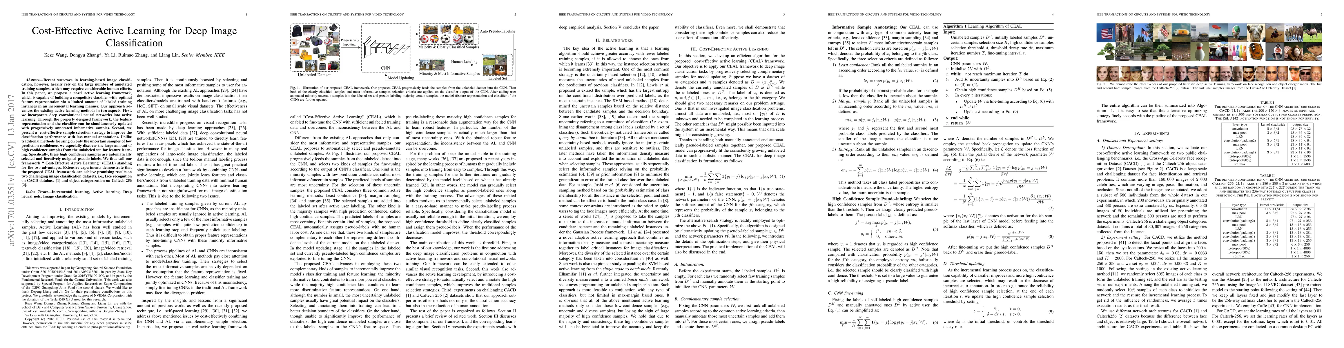 This paper proposes a cost-effective active learning framework (CEAL) that integrates deep convolutional neural networks to build a competitive classifier using minimal labeled training samples. It selects high confidence samples from the unlabeled set for pseudo-labeling, achieving better performance with fewer annotations.