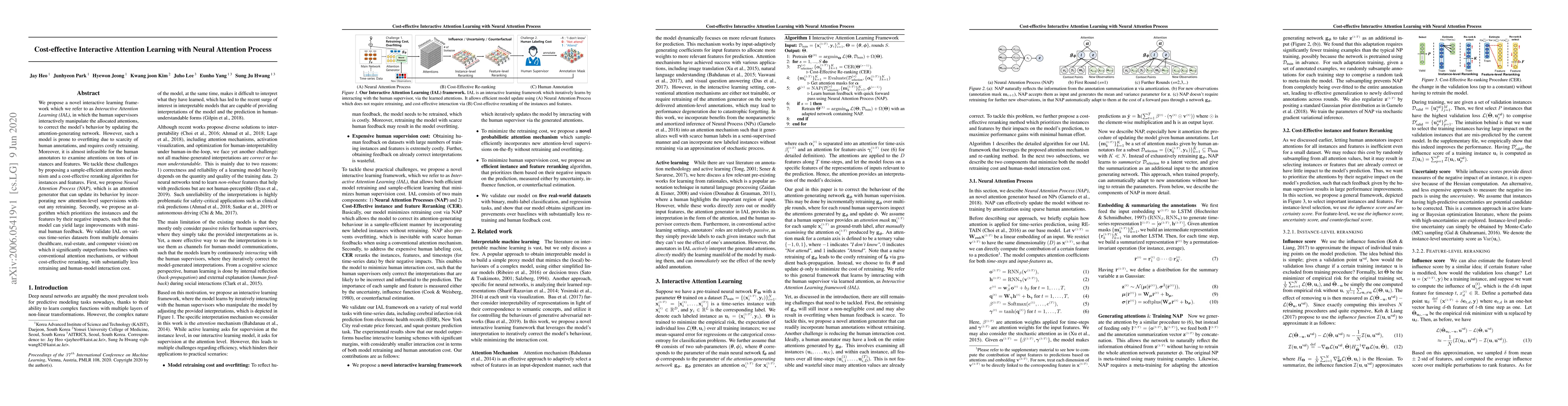 This paper introduces Interactive Attention Learning (IAL), a framework where human supervisors correct model behavior by adjusting attentions, addressing overfitting and high retraining costs through a sample-efficient attention mechanism and a cost-effective reranking algorithm. The proposed Neural Attention Process (NAP) updates attentions without retraining, and the reranking algorithm prioritizes instances and features for minimal human feedback, achieving significant performance gains with reduced human-model interaction costs.