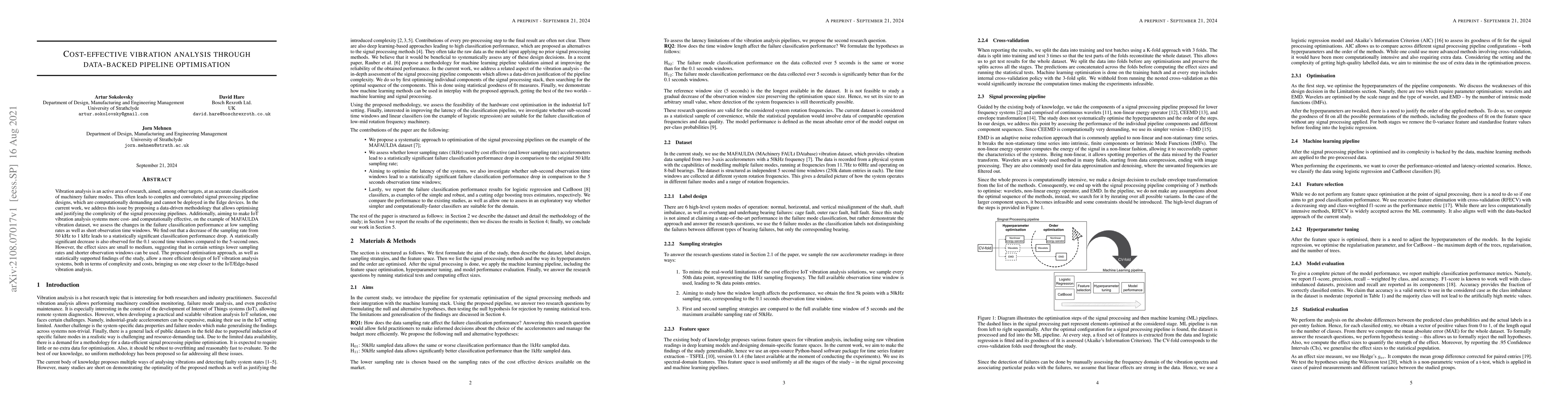 This paper proposes a data-driven methodology to optimize signal processing pipelines for cost-effective vibration analysis, demonstrating that lower sampling rates and shorter observation windows can still yield acceptable failure classification performance, thus enabling more efficient IoT-based systems. The study finds that while there is a performance drop at lower sampling rates and shorter windows, the effect sizes are small to medium, suggesting feasible optimizations for edge devices.