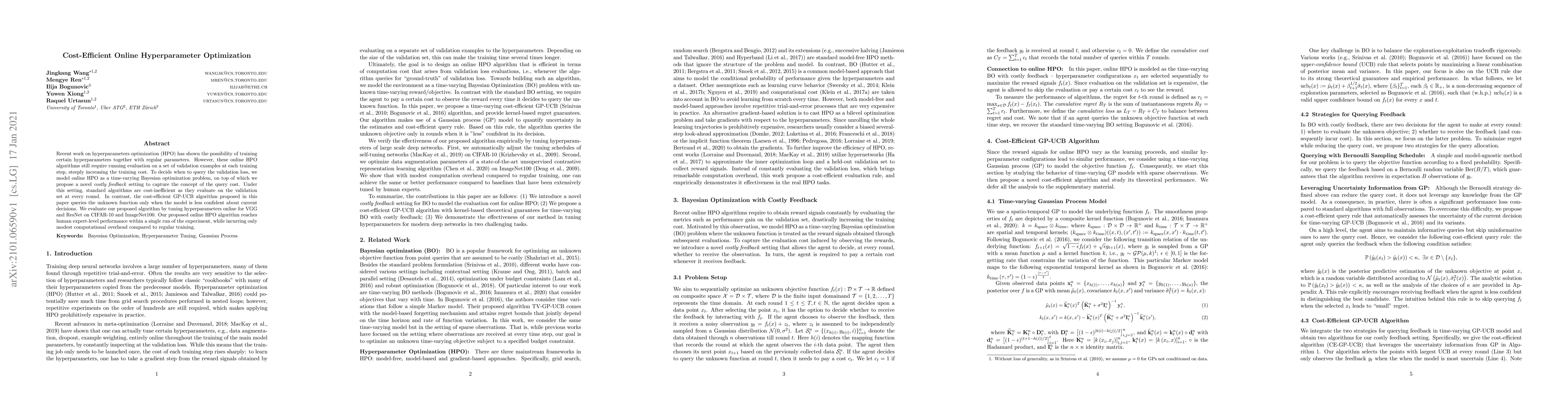 Recent work on hyperparameters optimization (HPO) has shown the possibility of training certain hyperparameters together with regular parameters. However, these online HPO algorithms still require running evaluation on a set of validation examples at each training step, steeply increasing the training cost. To decide when to query the validation loss, we model online HPO as a time-varying Bayesian optimization problem, on top of which we propose a novel \textit{costly feedback} setting to capture the concept of the query cost. Under this setting, standard algorithms are cost-inefficient as they evaluate on the validation set at every round. In contrast, the cost-efficient GP-UCB algorithm proposed in this paper queries the unknown function only when the model is less confident about current decisions. We evaluate our proposed algorithm by tuning hyperparameters online for VGG and ResNet on CIFAR-10 and ImageNet100. Our proposed online HPO algorithm reaches human expert-level performance within a single run of the experiment, while incurring only modest computational overhead compared to regular training.