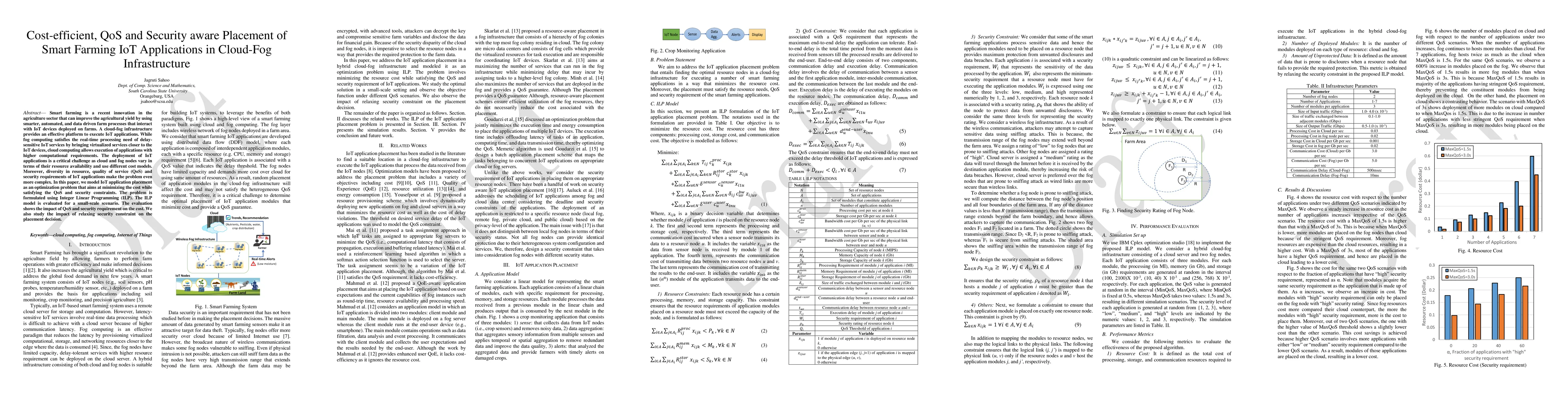 This paper proposes an optimization model using Integer Linear Programming (ILP) to efficiently place smart farming IoT applications in a cloud-fog infrastructure, balancing cost, QoS, and security constraints. The evaluation demonstrates the influence of QoS and security on cost and explores the effects of relaxing security requirements on application placement.