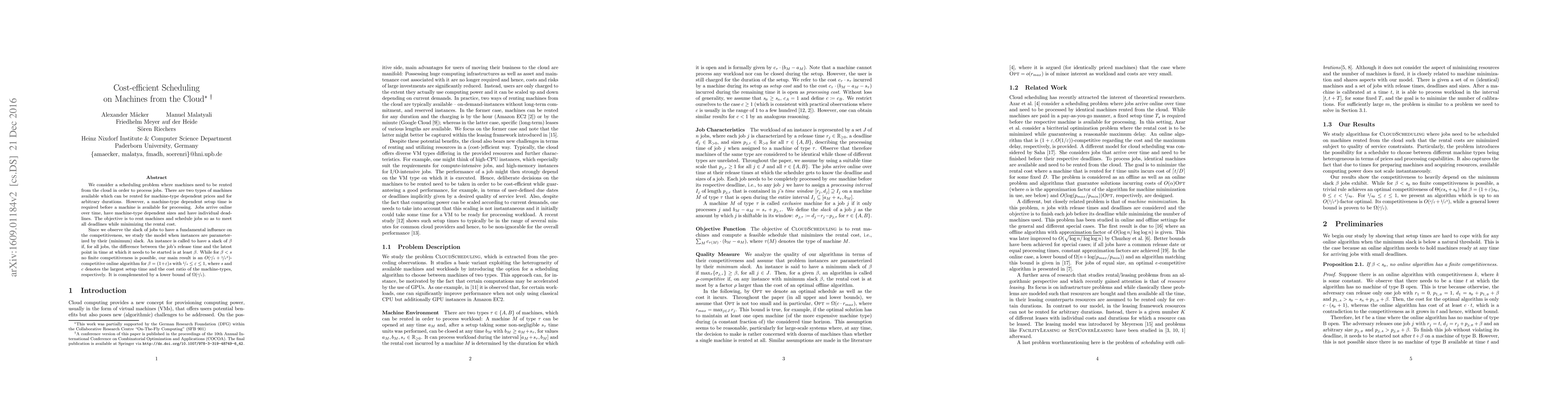 Researchers developed an online algorithm for scheduling jobs on rented cloud machines to minimize rental cost while meeting deadlines, achieving $O(rac{c}{oldsymbol{ uarepsilon}} + rac{1}{oldsymbol{ uarepsilon}^3})$-competitiveness in the optimal range of $eta = (1+oldsymbol{ uarepsilon})s$.