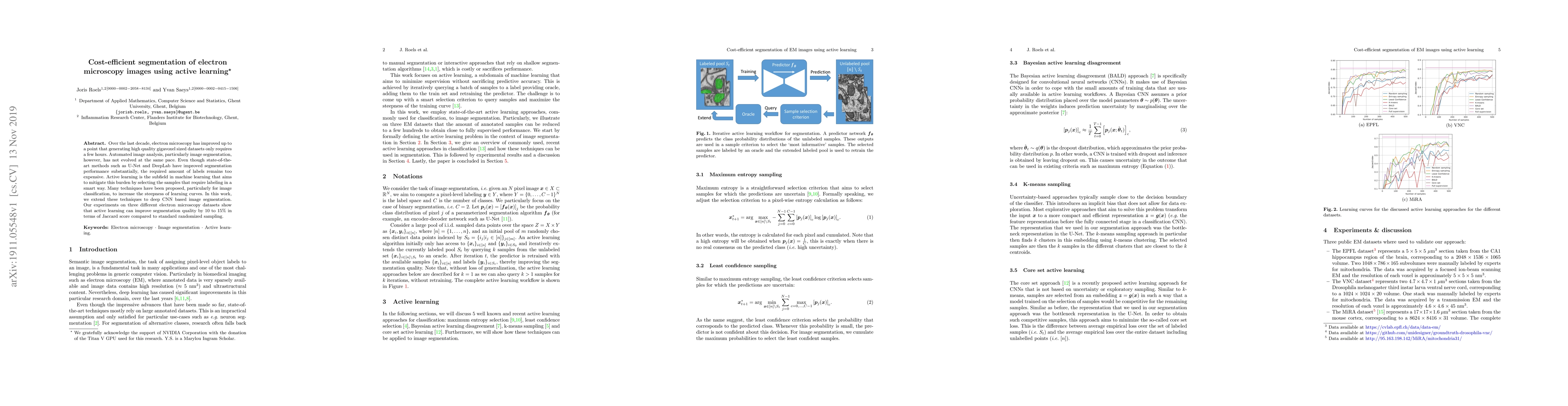 Over the last decade, electron microscopy has improved up to a point that generating high quality gigavoxel sized datasets only requires a few hours. Automated image analysis, particularly image segmentation, however, has not evolved at the same pace. Even though state-of-the-art methods such as U-Net and DeepLab have improved segmentation performance substantially, the required amount of labels remains too expensive. Active learning is the subfield in machine learning that aims to mitigate this burden by selecting the samples that require labeling in a smart way. Many techniques have been proposed, particularly for image classification, to increase the steepness of learning curves. In this work, we extend these techniques to deep CNN based image segmentation. Our experiments on three different electron microscopy datasets show that active learning can improve segmentation quality by 10 to 15% in terms of Jaccard score compared to standard randomized sampling.