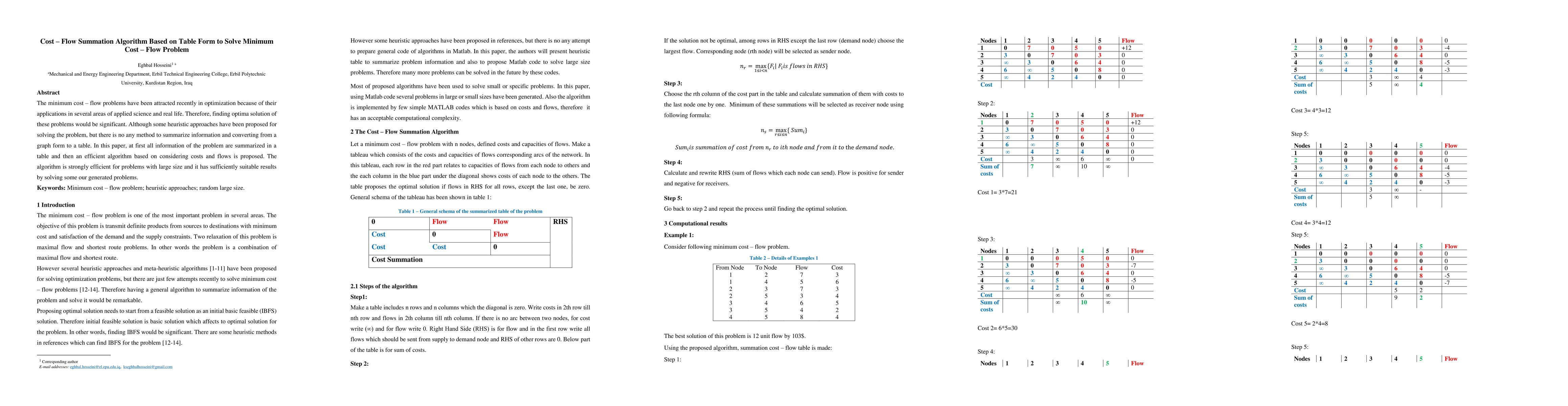 The minimum cost-flow problems have been attracted recently in optimization because of their applications in several areas of applied science and real life. Therefore, finding optima solution of these problems would be significant. Although some heuristic approaches have been proposed for solving the problem, but there is no any method to summarize information and converting from a graph form to a table. In this paper, at first all information of the problem are summarized in a table and then an efficient algorithm based on considering costs and flows is proposed. The algorithm is strongly efficient for problems with large size and it has sufficiently suitable results by solving some our generated problems.