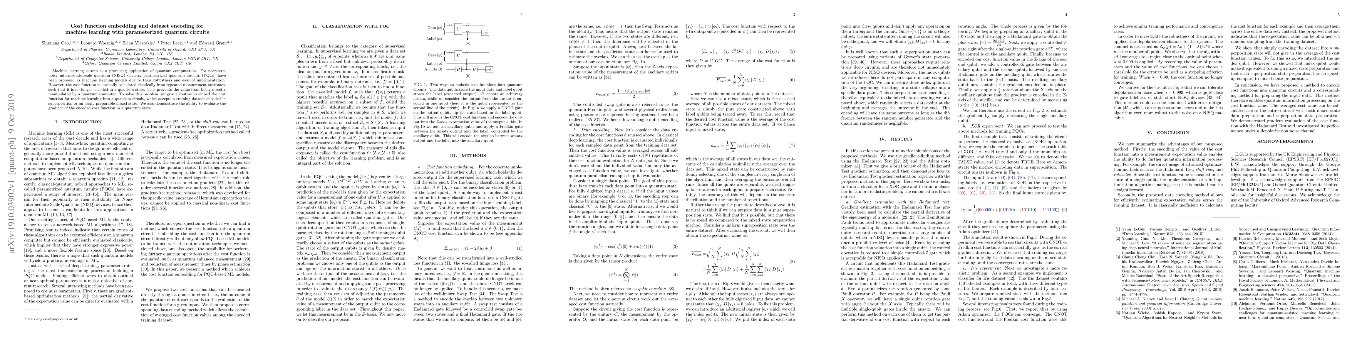 Machine learning is seen as a promising application of quantum computation. For near-term noisy intermediate-scale quantum (NISQ) devices, parametrized quantum circuits (PQCs) have been proposed as machine learning models due to their robustness and ease of implementation. However, the cost function is normally calculated classically from repeated measurement outcomes, such that it is no longer encoded in a quantum state. This prevents the value from being directly manipulated by a quantum computer. To solve this problem, we give a routine to embed the cost function for machine learning into a quantum circuit, which accepts a training dataset encoded in superposition or an easily preparable mixed state. We also demonstrate the ability to evaluate the gradient of the encoded cost function in a quantum state.