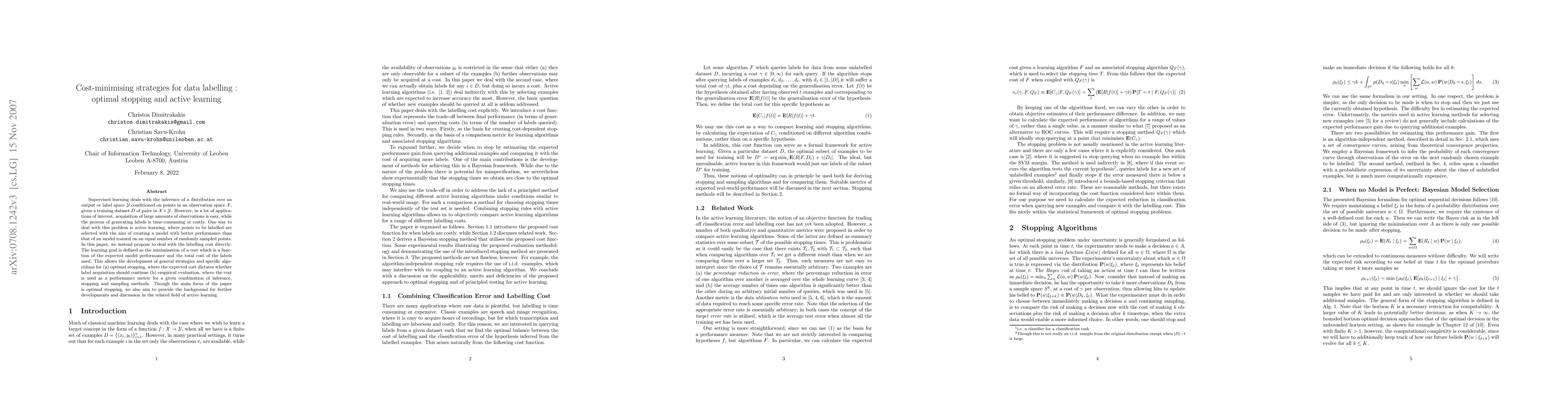 This paper proposes cost-minimising strategies for data labelling, focusing on optimal stopping and active learning to reduce the expensive process of label acquisition. It develops algorithms that balance model performance with labelling costs, providing a framework for evaluating and improving labelling strategies.