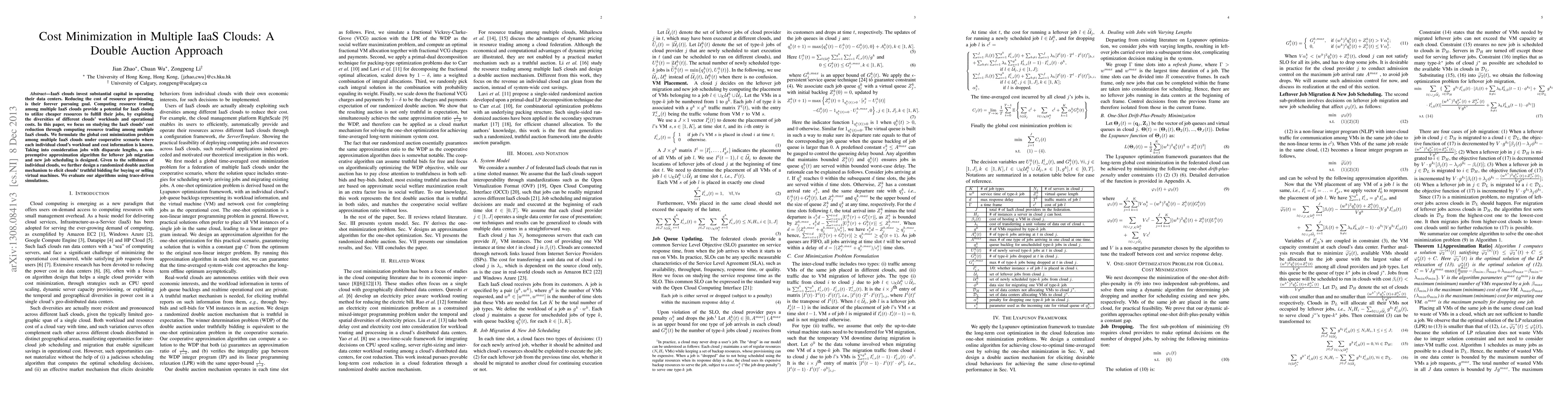 This paper explores reducing IaaS cloud operational costs through resource trading among multiple clouds using a cooperative double auction mechanism. The authors propose an algorithm for job scheduling and migration to minimize global costs, addressing the selfish nature of individual clouds with a truthful bidding system.
