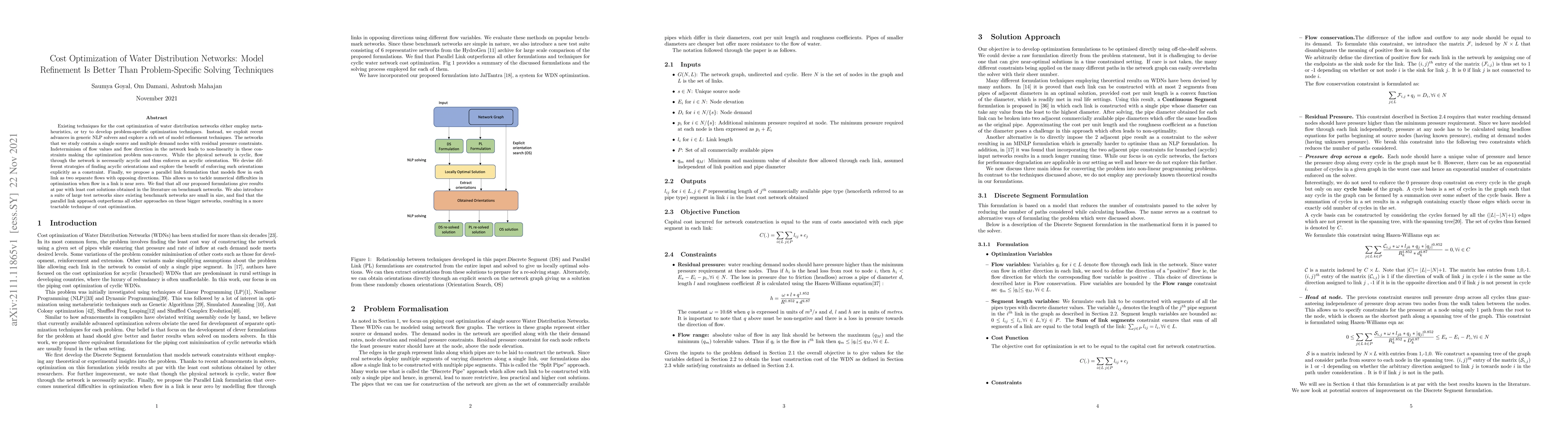 Existing techniques for the cost optimization of water distribution networks either employ meta-heuristics, or try to develop problem-specific optimization techniques. Instead, we exploit recent advances in generic NLP solvers and explore a rich set of model refinement techniques. The networks that we study contain a single source and multiple demand nodes with residual pressure constraints. Indeterminism of flow values and flow direction in the network leads to non-linearity in these constraints making the optimization problem non-convex. While the physical network is cyclic, flow through the network is necessarily acyclic and thus enforces an acyclic orientation. We devise different strategies of finding acyclic orientations and explore the benefit of enforcing such orientations explicitly as a constraint. Finally, we propose a parallel link formulation that models flow in each link as two separate flows with opposing directions. This allows us to tackle numerical difficulties in optimization when flow in a link is near zero. We find that all our proposed formulations give results at par with least cost solutions obtained in the literature on benchmark networks. We also introduce a suite of large test networks since existing benchmark networks are small in size, and find that the parallel link approach outperforms all other approaches on these bigger networks, resulting in a more tractable technique of cost optimization.