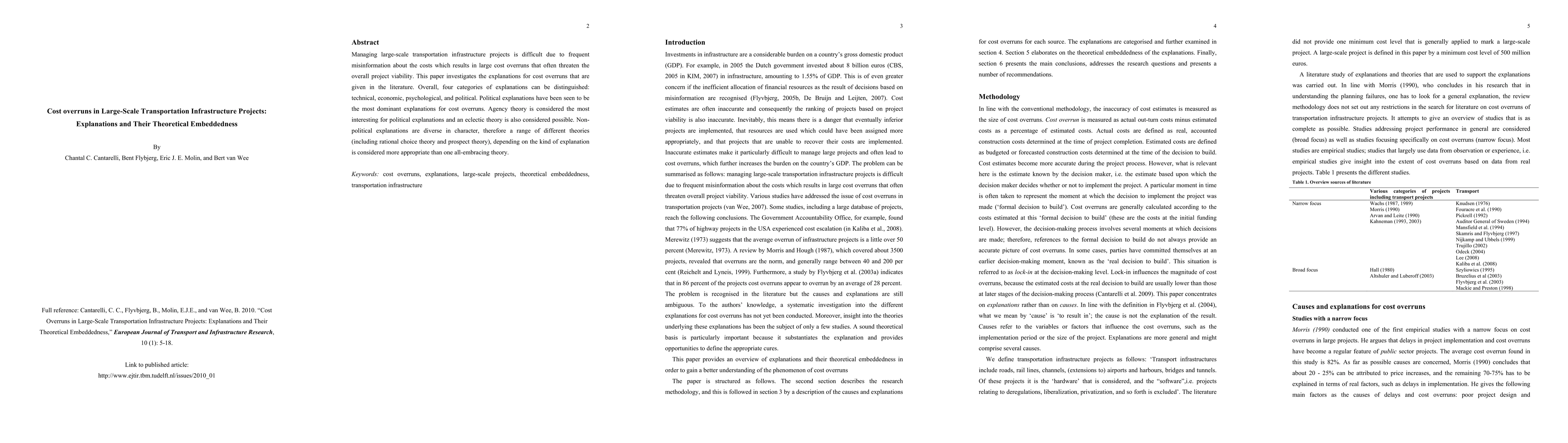 This paper examines the causes of cost overruns in large-scale transportation infrastructure projects, identifying four main categories: technical, economic, psychological, and political. Political explanations, particularly those grounded in agency theory, are found to be the most prevalent, while nonpolitical explanations vary and are best addressed by different theories like rational choice and prospect theory.