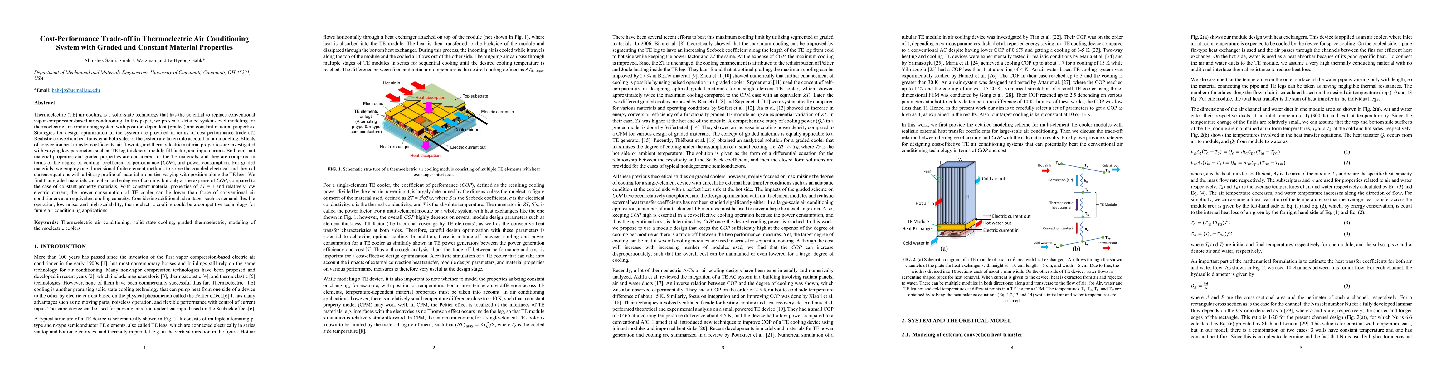 This paper models thermoelectric air conditioning systems with graded and constant material properties, optimizing design for cost-performance trade-offs. Graded materials enhance cooling but reduce the coefficient of performance, while constant properties enable lower power consumption comparable to conventional systems.