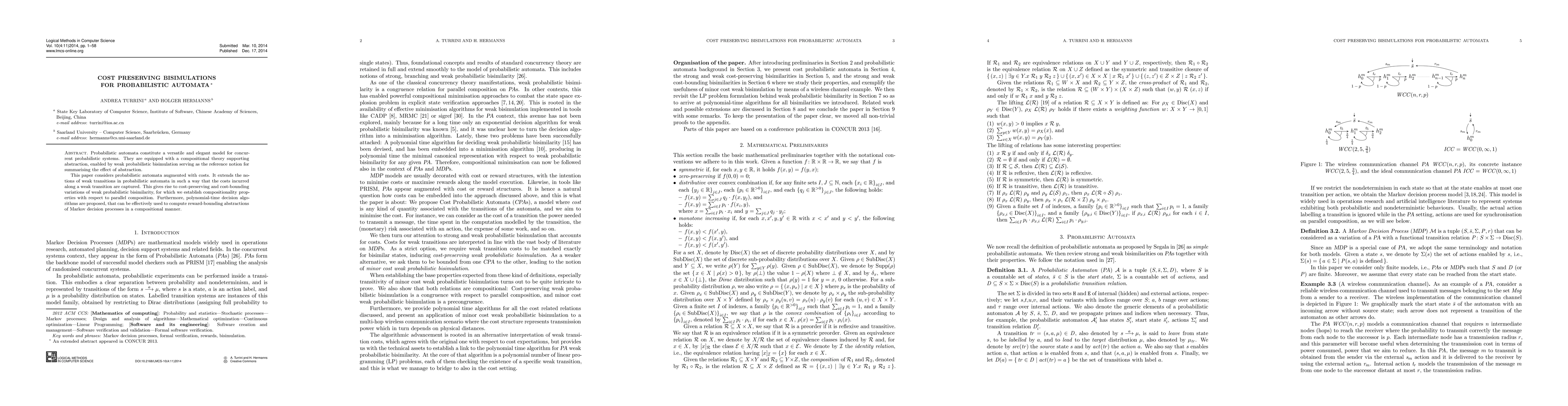 This paper extends probabilistic automata to include cost-incurring transitions, introducing cost-preserving bisimulations. It establishes compositionality and proposes polynomial-time algorithms for computing reward-bounding abstractions in Markov decision processes.