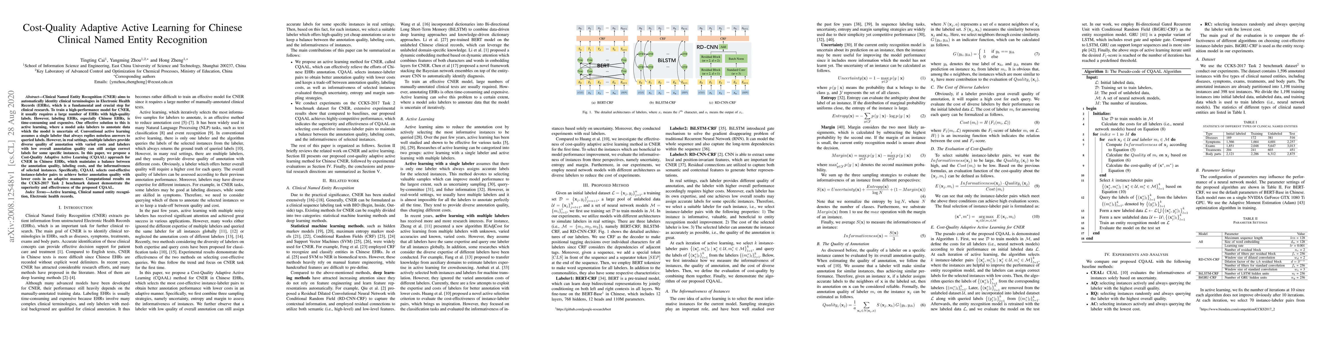 This paper proposes a Cost-Quality Adaptive Active Learning (CQAAL) approach to enhance Clinical Named Entity Recognition (CNER) in Chinese Electronic Health Records (EHRs). The method balances annotation quality, labeling costs, and instance informativeness by selecting cost-effective instance-labeler pairs, demonstrating superior performance on the CCKS-2017 Task 2 benchmark dataset.