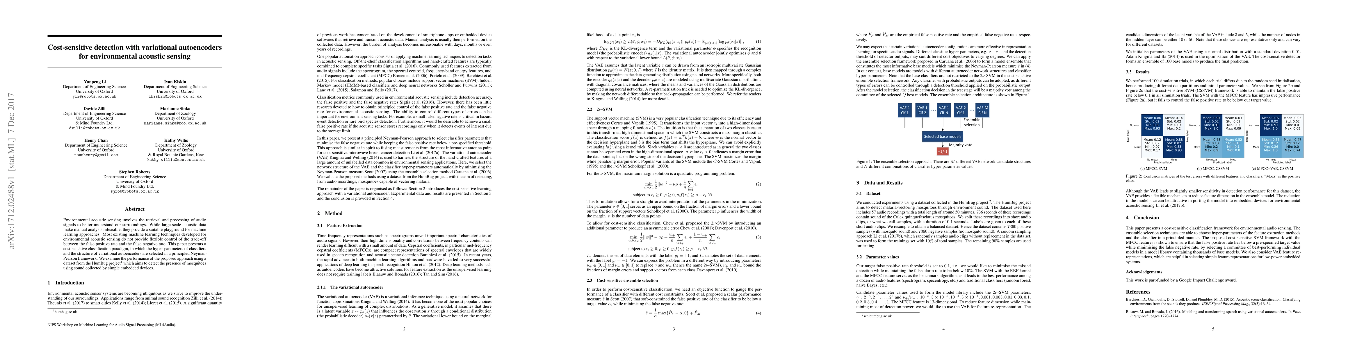 Environmental acoustic sensing involves the retrieval and processing of audio signals to better understand our surroundings. While large-scale acoustic data make manual analysis infeasible, they provide a suitable playground for machine learning approaches. Most existing machine learning techniques developed for environmental acoustic sensing do not provide flexible control of the trade-off between the false positive rate and the false negative rate. This paper presents a cost-sensitive classification paradigm, in which the hyper-parameters of classifiers and the structure of variational autoencoders are selected in a principled Neyman-Pearson framework. We examine the performance of the proposed approach using a dataset from the HumBug project which aims to detect the presence of mosquitoes using sound collected by simple embedded devices.
