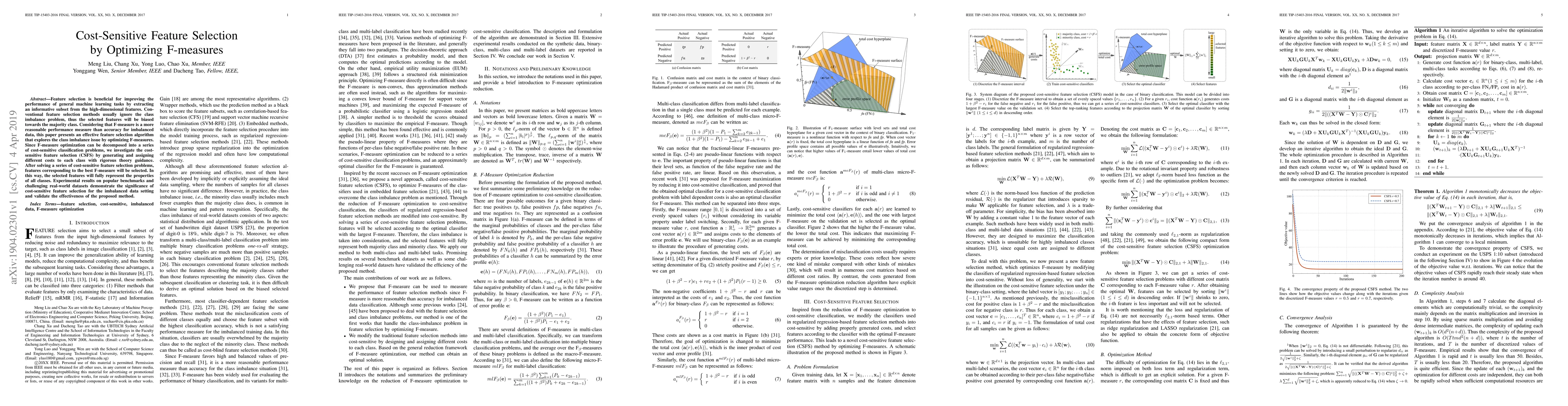 This paper introduces a novel feature selection algorithm that optimizes F-measures to address class imbalance in machine learning tasks, transforming F-measure optimization into a series of cost-sensitive classification problems. Experimental results show the method's effectiveness in selecting features that better represent all classes in imbalanced datasets.