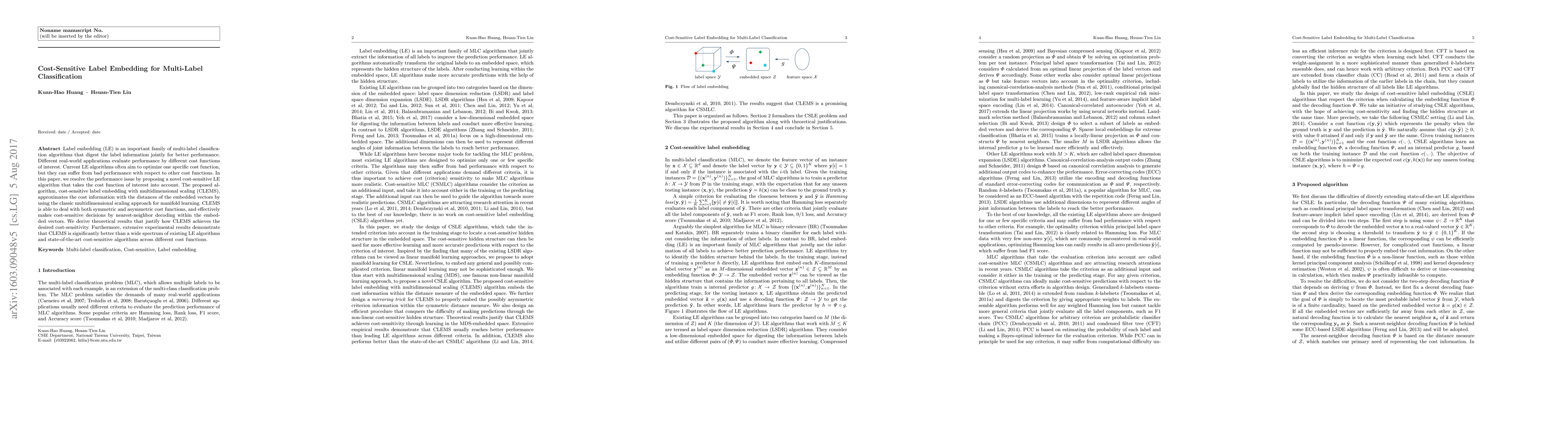 This paper proposes CLEMS, a novel cost-sensitive label embedding algorithm for multi-label classification that optimizes various cost functions through multidimensional scaling, outperforming existing algorithms in experiments. Theoretical results support its cost-sensitive decision-making and effectiveness across symmetric and asymmetric cost functions.
