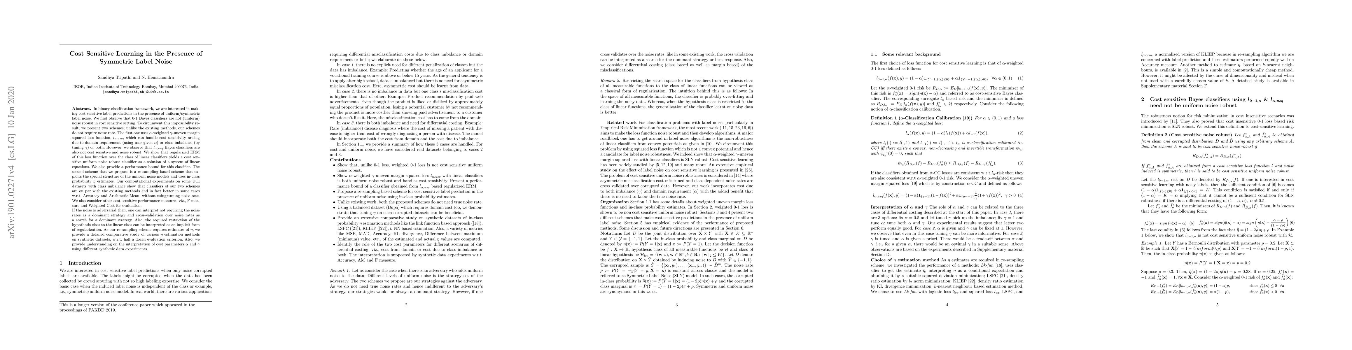This paper proposes two cost-sensitive learning schemes to handle symmetric label noise in binary classification, without requiring noise rate estimates. The first scheme uses a regularized loss function, while the second employs a re-sampling method leveraging in-class probability estimates. Both schemes show competitive performance on UCI datasets.