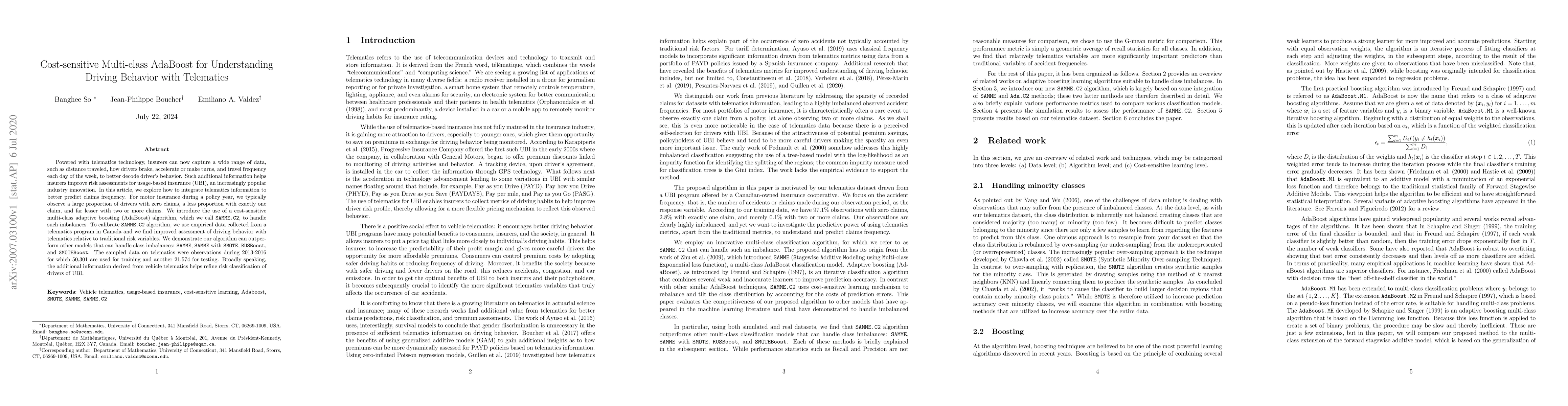 This paper introduces a cost-sensitive multi-class AdaBoost algorithm, SAMME.C2, to predict claims frequency using telematics data for usage-based insurance. The algorithm outperforms traditional models and other methods in handling class imbalances, improving the assessment of driving behavior.