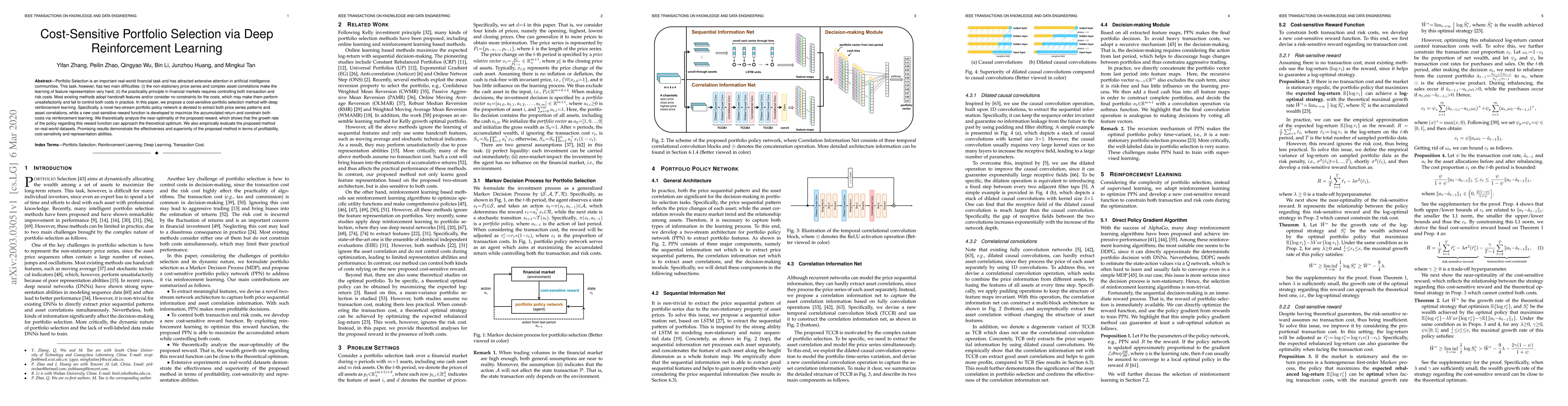 This paper proposes a cost-sensitive portfolio selection method using deep reinforcement learning, featuring a two-stream portfolio policy network to extract price patterns and correlations, and a cost-sensitive reward function to balance returns and costs. Theoretical and empirical evaluations show its effectiveness in profitability and cost control.