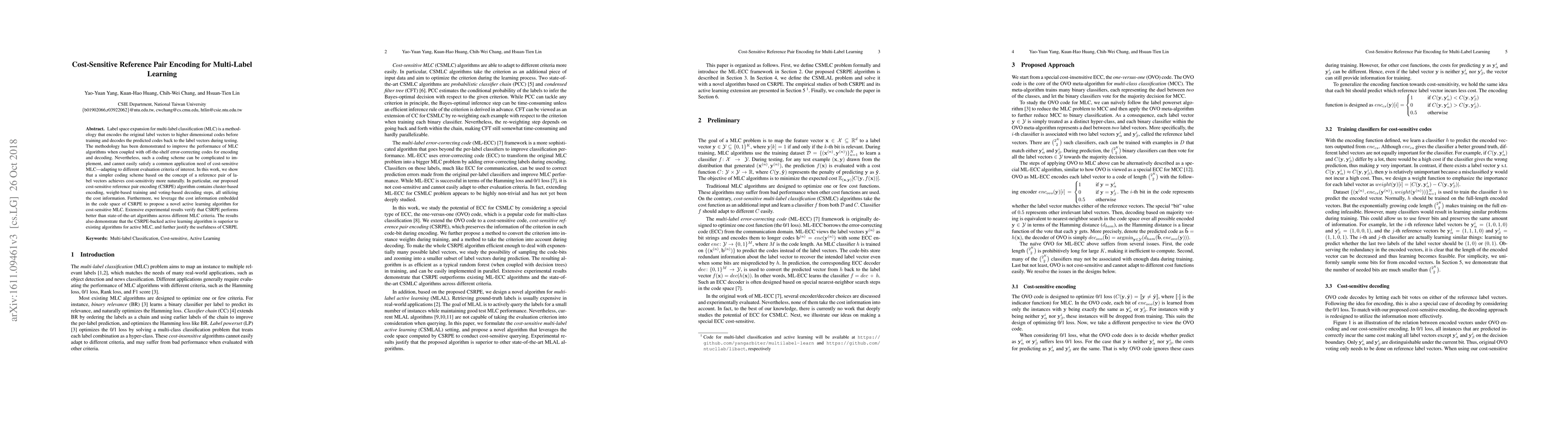 This paper proposes a cost-sensitive reference pair encoding (CSRPE) algorithm for multi-label learning, which simplifies the implementation of cost-sensitive methodologies and outperforms state-of-the-art algorithms. CSRPE integrates cost information into cluster-based encoding, weight-based training, and voting-based decoding, and it also supports an effective active learning approach for cost-sensitive multi-label classification.