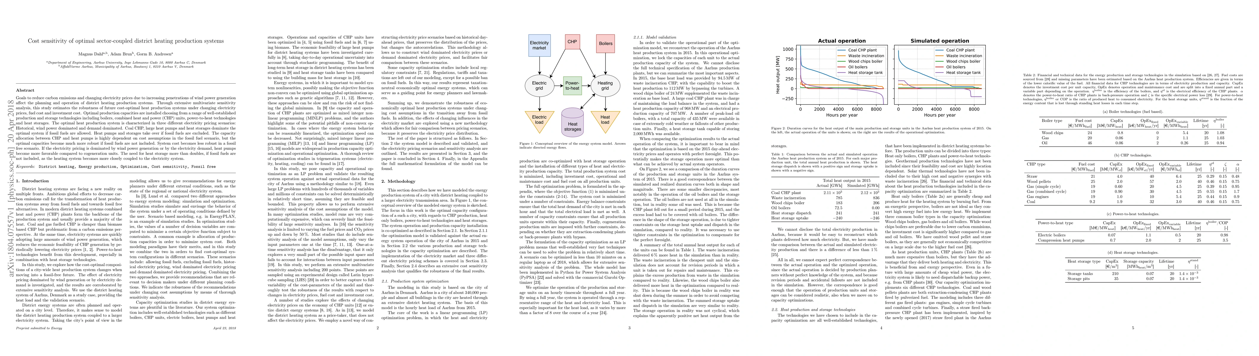 Goals to reduce carbon emissions and changing electricity prices due to increasing penetrations of wind power generation affect the planning and operation of district heating production systems. Through extensive multivariate sensitivity analysis, this study estimates the robustness of future cost-optimal heat production systems under changing electricity prices, fuel cost and investment cost. Optimal production capacities are installed choosing from a range of well-established production and storage technologies including boilers, combined heat and power (CHP) units, power-to-heat technologies and heat storages. The optimal heat production system is characterized in three different electricity pricing scenarios: Historical, wind power dominated and demand dominated. Coal CHP, large heat pumps and heat storages dominate the optimal system if fossil fuels are allowed. Heat pumps and storages take over if fossil fuels are excluded. The capacity allocation between CHP and heat pumps is highly dependent on cost assumptions in the fossil fuel scenario, but the optimal capacities become much more robust if fossil fuels are not included. System cost becomes less robust in a fossil free scenario. If the electricity pricing is dominated by wind power generation or by the electricity demand, heat pumps become more favorable compared to cogeneration units. The need for heat storage more than doubles, if fossil fuels are not included, as the heating system becomes more closely coupled to the electricity system.