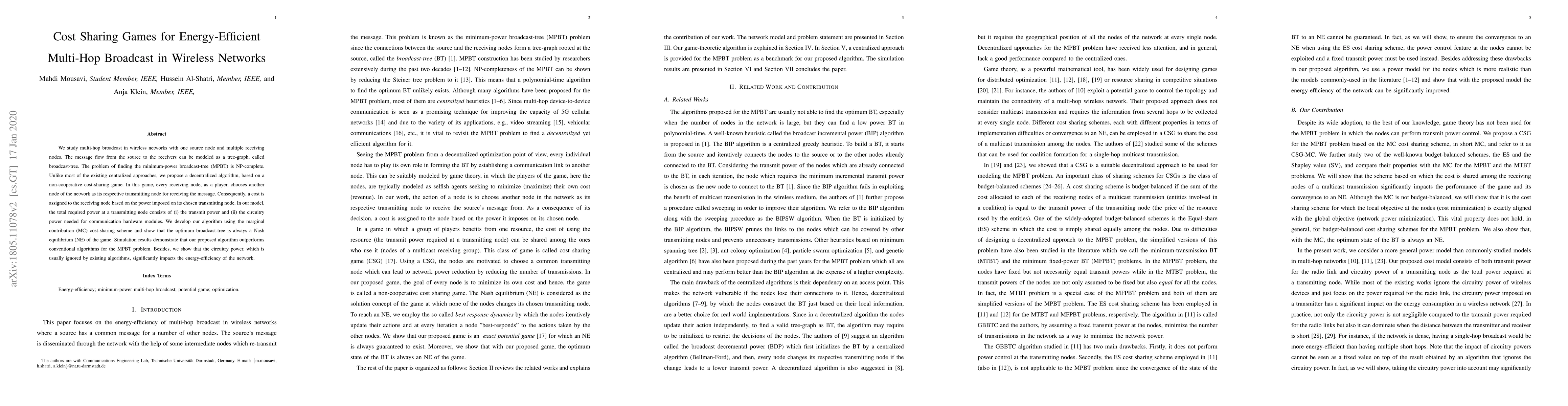 This paper proposes a decentralized algorithm for finding the minimum-power broadcast-tree in wireless networks using a non-cooperative cost-sharing game. The algorithm considers both transmit and circuitry power, demonstrating improved energy efficiency and outperforming conventional methods.