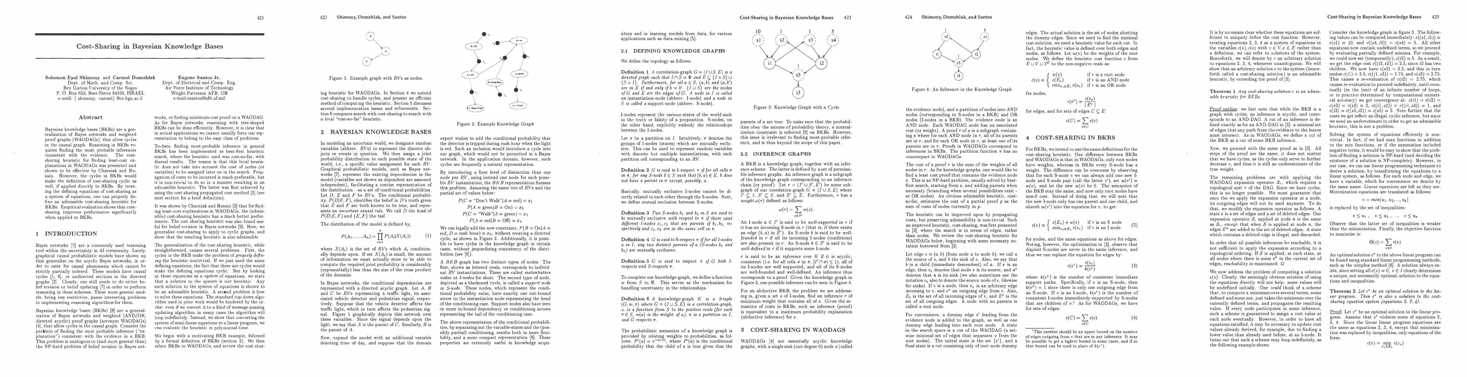 Bayesian knowledge bases (BKBs) are a generalization of Bayes networks and weighted proof graphs (WAODAGs), that allow cycles in the causal graph. Reasoning in BKBs requires finding the most probable inferences consistent with the evidence. The cost-sharing heuristic for finding least-cost explanations in WAODAGs was presented and shown to be effective by Charniak and Husain. However, the cycles in BKBs would make the definition of cost-sharing cyclic as well, if applied directly to BKBs. By treating the defining equations of cost-sharing as a system of equations, one can properly define an admissible cost-sharing heuristic for BKBs. Empirical evaluation shows that cost-sharing improves performance significantly when applied to BKBs.
