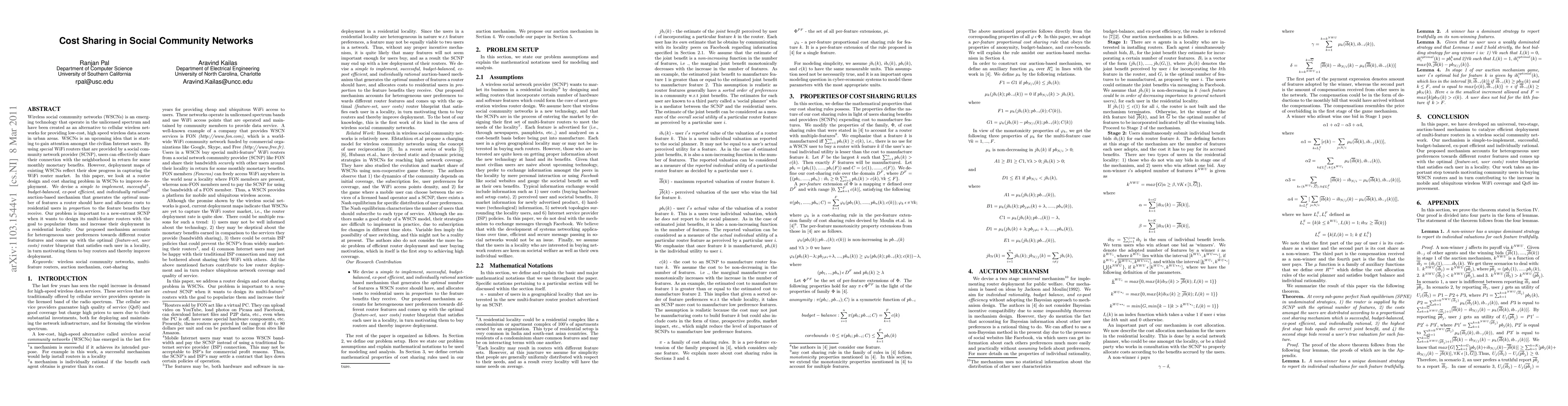Wireless social community networks (WSCNs) is an emerging technology that operate in the unlicensed spectrum and have been created as an alternative to cellular wireless networks for providing low-cost, high speed wireless data access in urban areas. WSCNs is an upcoming idea that is starting to gain attention amongst the civilian Internet users. By using \emph{special} WiFi routers that are provided by a social community network provider (SCNP), users can effectively share their connection with the neighborhood in return for some monthly monetary benefits. However, deployment maps of existing WSCNs reflect their slow progress in capturing the WiFi router market. In this paper, we look at a router design and cost sharing problem in WSCNs to improve deployment. We devise asimple to implement, successful a mechanism is successful if it achieves its intended purpose. For example in this work, a successful mechanism would help install routers in a locality}, \emph{budget-balanced}, \emph{ex-post efficient}, and \emph{individually rational} {a mechanism is individually rational if the benefit each agent obtains is greater than its cost.} auction-based mechanism that generates the \emph{optimal} number of features a router should have and allocates costs to residential users in \emph{proportion} to the feature benefits they receive. Our problem is important to a new-entrant SCNP when it wants to design its multi-feature routers with the goal to popularize them and increase their deployment in a residential locality. Our proposed mechanism accounts for heterogeneous user preferences towards different router features and comes up with the optimal \emph{(feature-set, user costs)} router blueprint that satisfies each user in a locality, in turn motivating them to buy routers and thereby improve deployment.