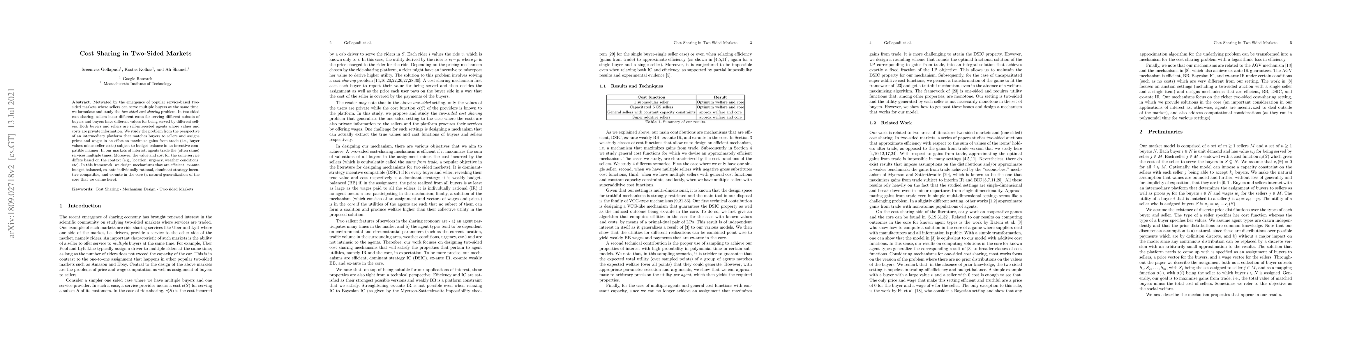 This paper explores the two-sided cost sharing problem in service-based markets where sellers serve multiple buyers with varying costs and buyers derive different values. The study designs mechanisms to maximize welfare while ensuring budget balance, incentive compatibility, and individual rationality.