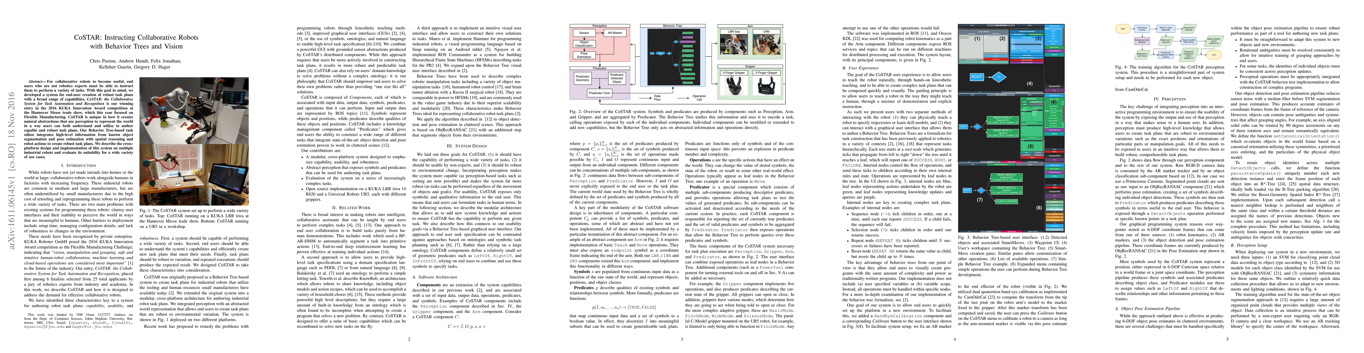 CoSTAR enables non-expert users to create robust task plans for collaborative robots using Behavior Trees and vision-based abstractions. The system was recognized in the 2016 KUKA Innovation Award competition and demonstrates versatility across various industrial robots.