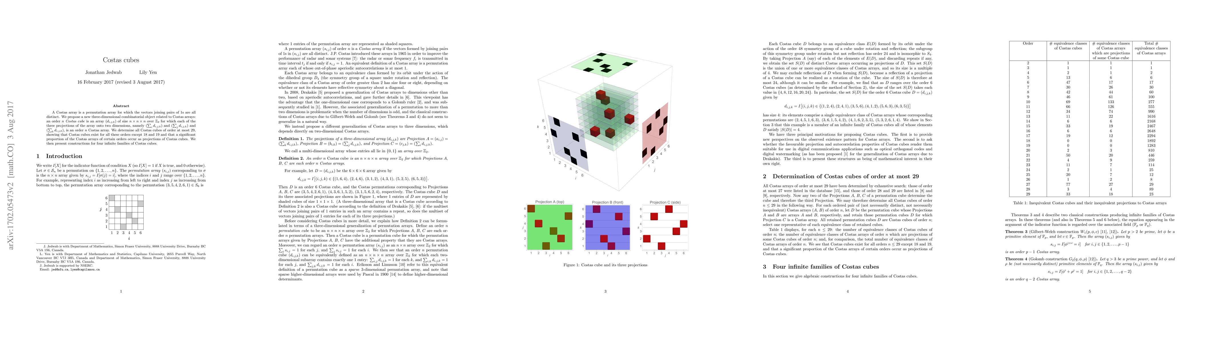 Researchers discovered a new combinatorial object called Costas cubes, which are three-dimensional arrays where each projection is an order n Costas array, except for orders 18 and 19. They also presented constructions for four infinite families of Costas cubes.