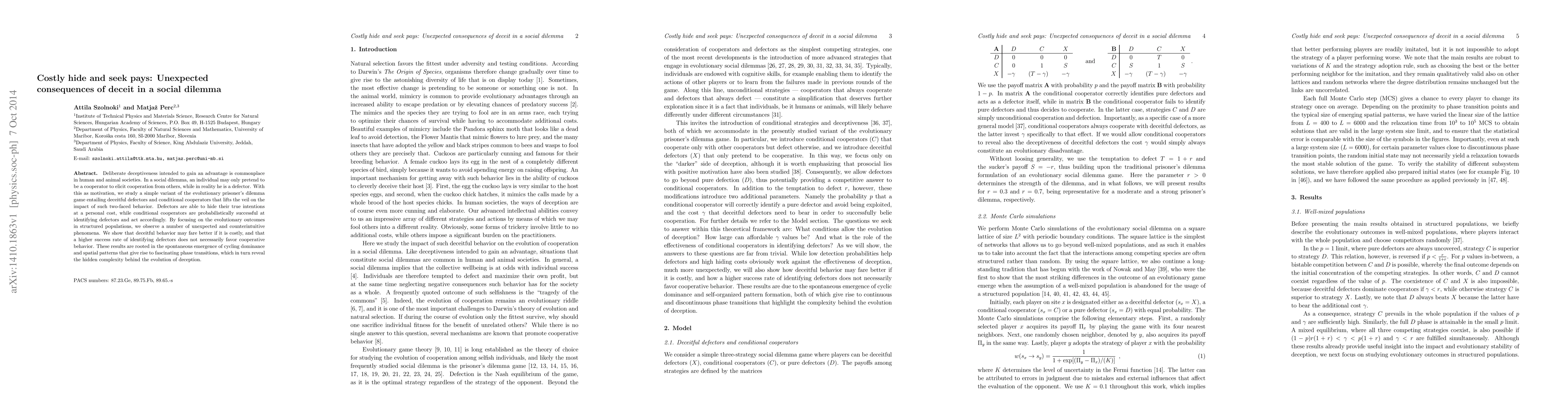 Deliberate deceptiveness intended to gain an advantage is commonplace in human and animal societies. In a social dilemma, an individual may only pretend to be a cooperator to elicit cooperation from others, while in reality he is a defector. With this as motivation, we study a simple variant of the evolutionary prisoner's dilemma game entailing deceitful defectors and conditional cooperators that lifts the veil on the impact of such two-faced behavior. Defectors are able to hide their true intentions at a personal cost, while conditional cooperators are probabilistically successful at identifying defectors and act accordingly. By focusing on the evolutionary outcomes in structured populations, we observe a number of unexpected and counterintuitive phenomena. We show that deceitful behavior may fare better if it is costly, and that a higher success rate of identifying defectors does not necessarily favor cooperative behavior. These results are rooted in the spontaneous emergence of cycling dominance and spatial patterns that give rise to fascinating phase transitions, which in turn reveal the hidden complexity behind the evolution of deception.