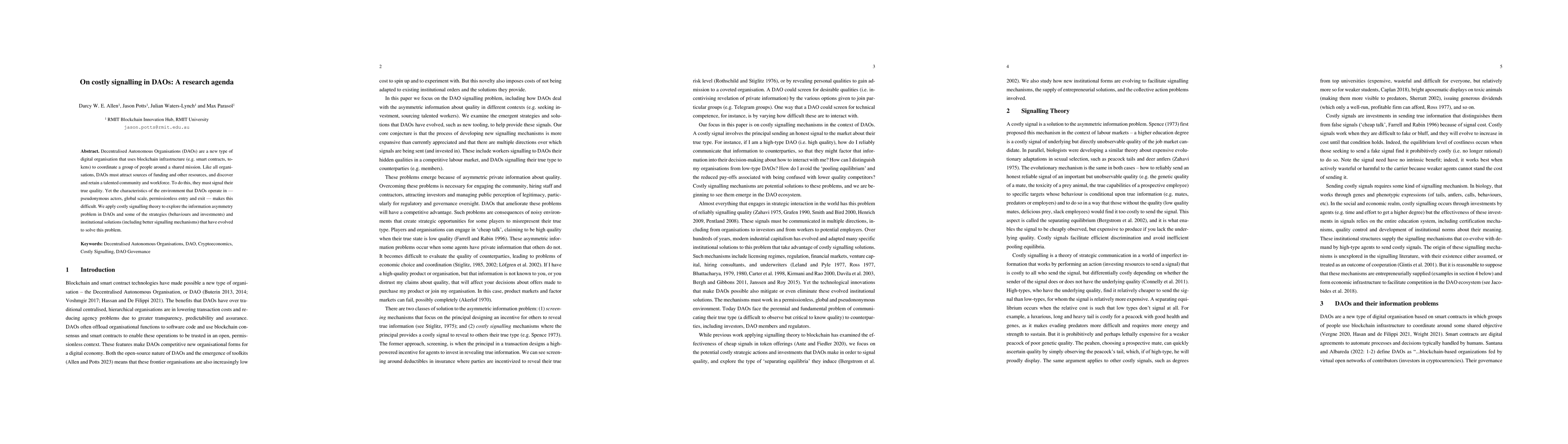 This paper explores how Decentralized Autonomous Organisations (DAOs) use costly signalling to overcome information asymmetry, addressing challenges from pseudonymity, global scale, and open access. It examines evolved strategies and institutional solutions to effectively convey quality and attract funding and talent.