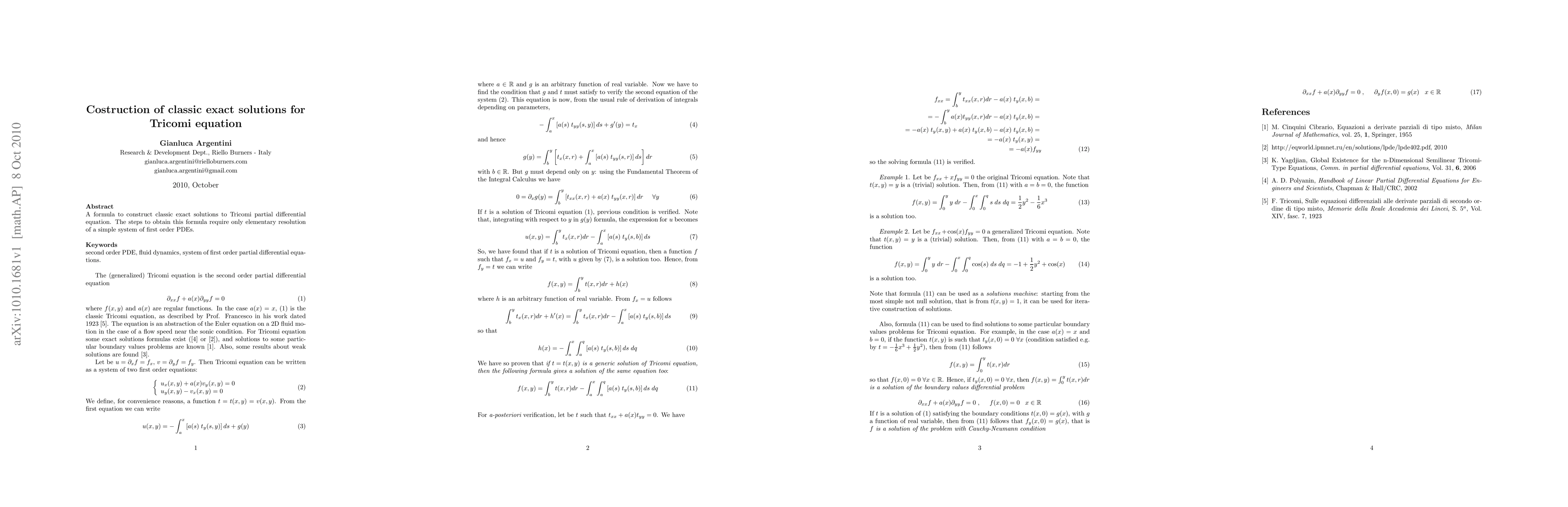 A formula to construct classic exact solutions to Tricomi partial differential equation. The steps to obtain this formula require only elementary resolution of a simple system of first order PDEs.