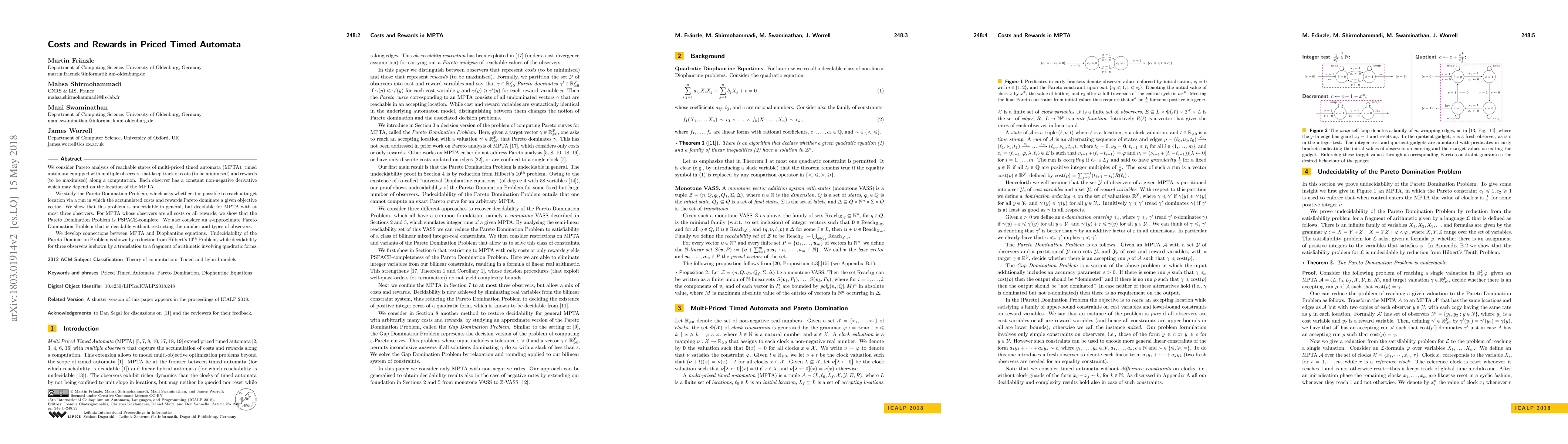 This paper investigates the Pareto Domination Problem in multi-priced timed automata (MPTA), showing it is undecidable in general but decidable for MPTA with up to three observers. It also establishes PSPACE-completeness for MPTA with all cost or reward observers.