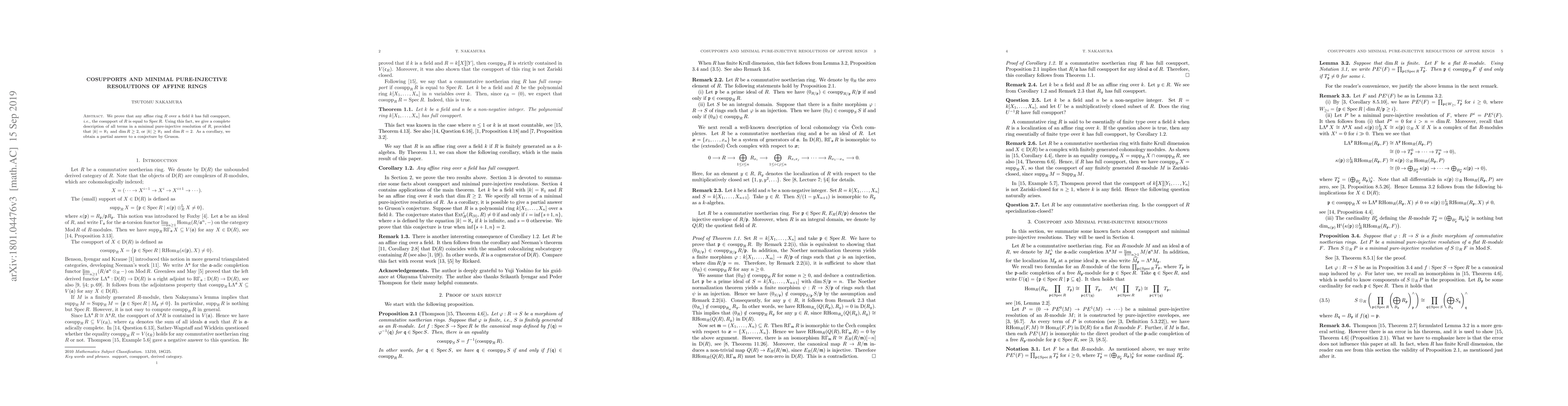 This paper proves that affine rings have full cosupport and describes minimal pure-injective resolutions for specific conditions on the ring's dimension and field cardinality.