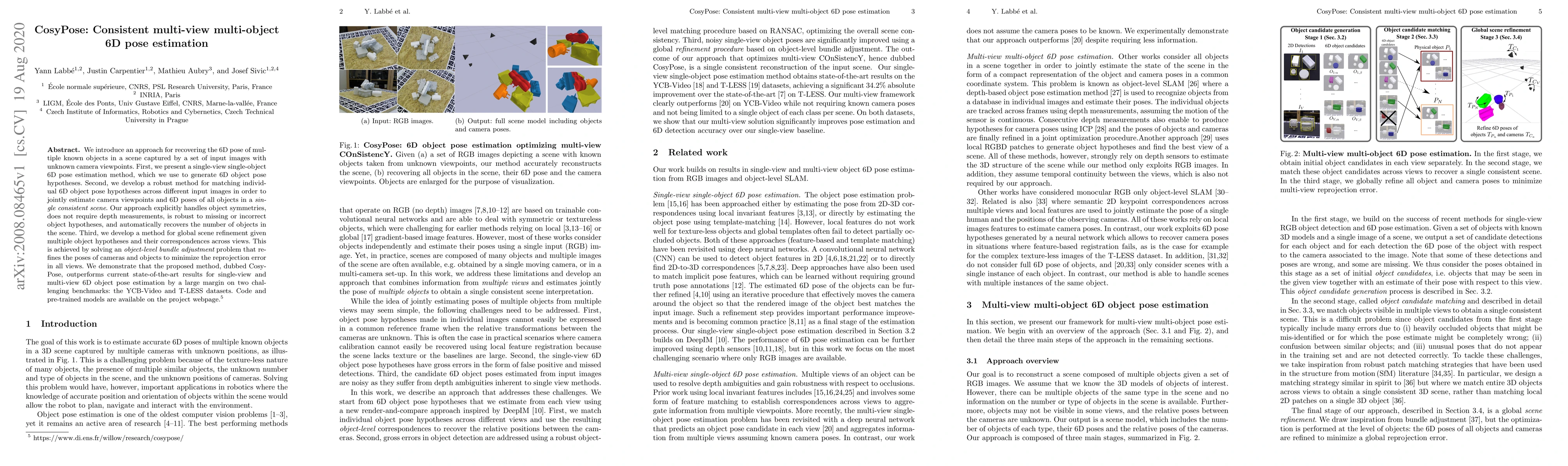 We introduce an approach for recovering the 6D pose of multiple known objects in a scene captured by a set of input images with unknown camera viewpoints. First, we present a single-view single-object 6D pose estimation method, which we use to generate 6D object pose hypotheses. Second, we develop a robust method for matching individual 6D object pose hypotheses across different input images in order to jointly estimate camera viewpoints and 6D poses of all objects in a single consistent scene. Our approach explicitly handles object symmetries, does not require depth measurements, is robust to missing or incorrect object hypotheses, and automatically recovers the number of objects in the scene. Third, we develop a method for global scene refinement given multiple object hypotheses and their correspondences across views. This is achieved by solving an object-level bundle adjustment problem that refines the poses of cameras and objects to minimize the reprojection error in all views. We demonstrate that the proposed method, dubbed CosyPose, outperforms current state-of-the-art results for single-view and multi-view 6D object pose estimation by a large margin on two challenging benchmarks: the YCB-Video and T-LESS datasets. Code and pre-trained models are available on the project webpage https://www.di.ens.fr/willow/research/cosypose/.