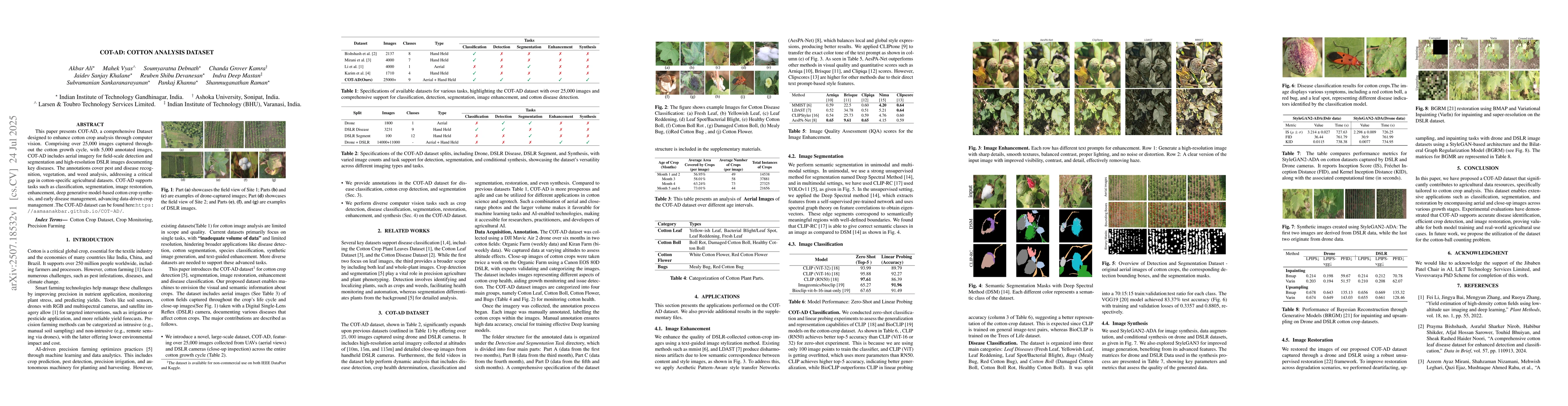 This paper presents COT-AD, a comprehensive Dataset designed to enhance cotton crop analysis through computer vision. Comprising over 25,000 images captured throughout the cotton growth cycle, with 5,000 annotated images, COT-AD includes aerial imagery for field-scale detection and segmentation and high-resolution DSLR images documenting key diseases. The annotations cover pest and disease recognition, vegetation, and weed analysis, addressing a critical gap in cotton-specific agricultural datasets. COT-AD supports tasks such as classification, segmentation, image restoration, enhancement, deep generative model-based cotton crop synthesis, and early disease management, advancing data-driven crop management