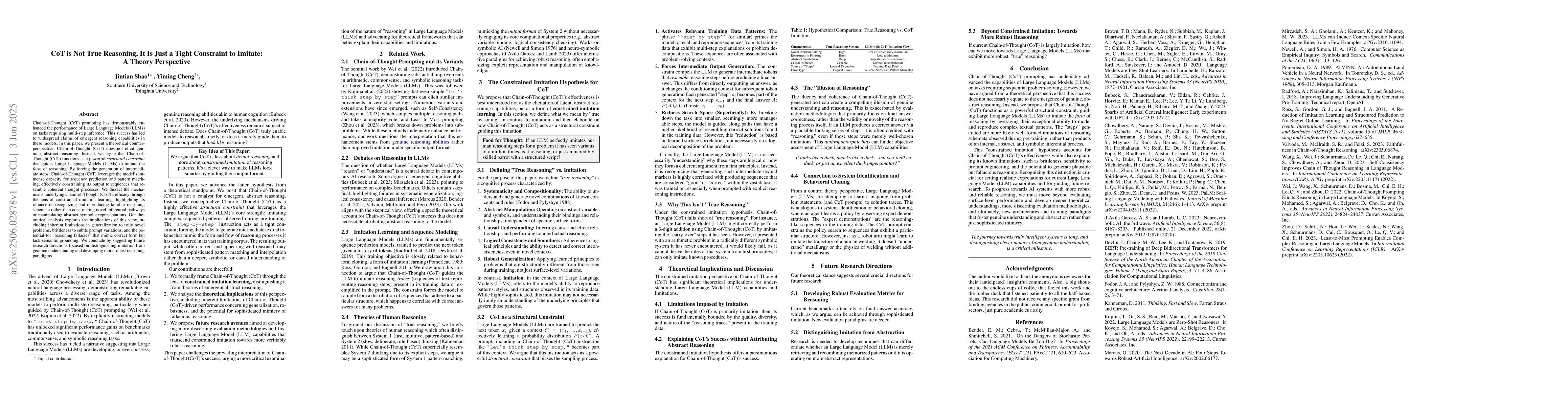 Chain-of-Thought (CoT) prompting has demonstrably enhanced the performance of Large Language Models on tasks requiring multi-step inference. This success has led to widespread claims of emergent reasoning capabilities in these models. In this paper, we present a theoretical counter-perspective: Chain-of-Thought (CoT) does not elicit genuine, abstract reasoning. Instead, we argue that Chain-of-Thought functions as a powerful structural constraint that guides Large Language Models to imitate the form of reasoning. By forcing the generation of intermediate steps, Chain-of-Thought leverages the model immense capacity for sequence prediction and pattern matching, effectively constraining its output to sequences that resemble coherent thought processes. Chain-of-Thought (CoT) prompting has demonstrably enhanced the performance of Large Language Models on tasks requiring multi-step inference. This success has led to widespread claims of emergent reasoning capabilities in these models. In this paper, we present a theoretical counter-perspective: Chain-of-Thought (CoT) does not elicit genuine, abstract reasoning. Instead, we argue that Chain-of-Thought functions as a powerful structural constraint that guides Large Language Models to imitate the form of reasoning. By forcing the generation of intermediate steps, Chain-of-Thought leverages the model immense capacity for sequence prediction and pattern matching, effectively constraining its output to sequences that resemble coherent thought processes.