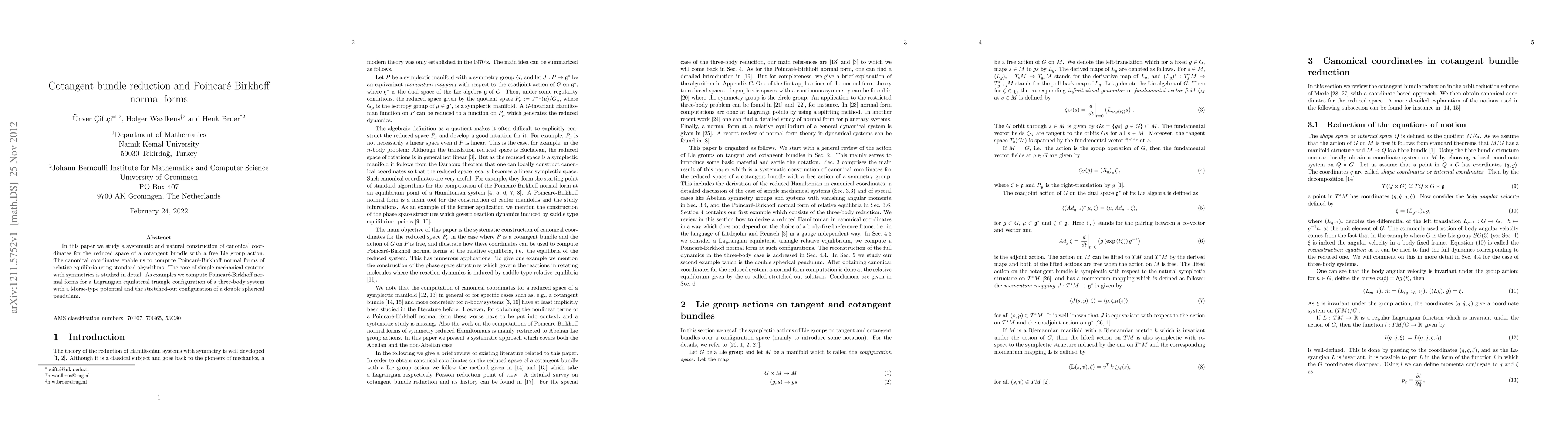 This paper develops canonical coordinates for the reduced space of a cotangent bundle under a free Lie group action, allowing computation of Poincaré-Birkhoff normal forms for relative equilibria. Detailed examples include normal forms for a three-body system and a double spherical pendulum.