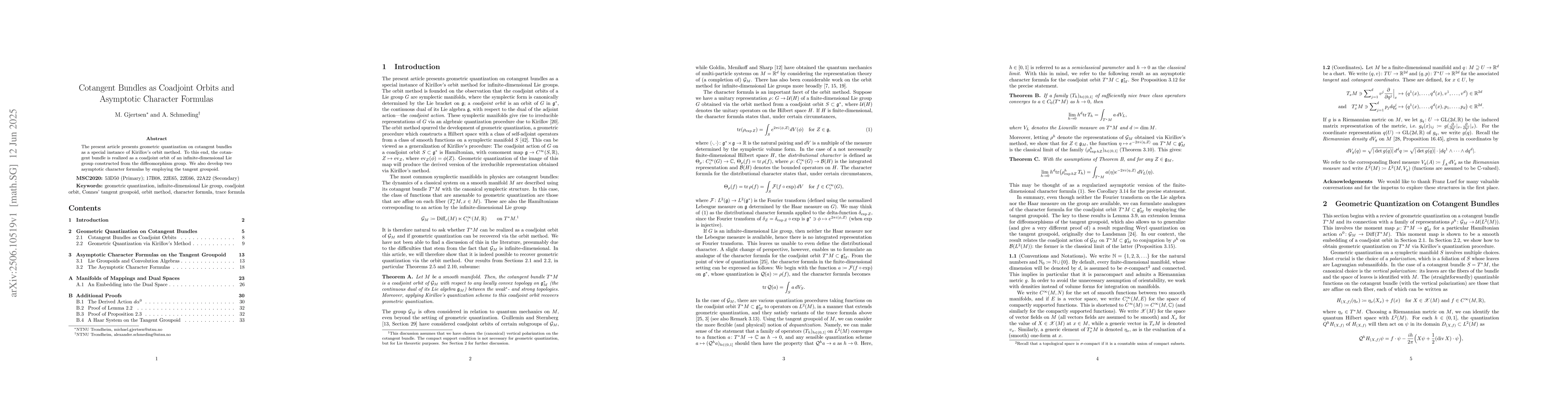 This paper uses Kirillov's orbit method to geometrically quantify cotangent bundles, developing asymptotic character formulas using a tangent groupoid, and realizing the cotangent bundle as a coadjoint orbit of an infinite-dimensional Lie group constructed from the diffeomorphism group.